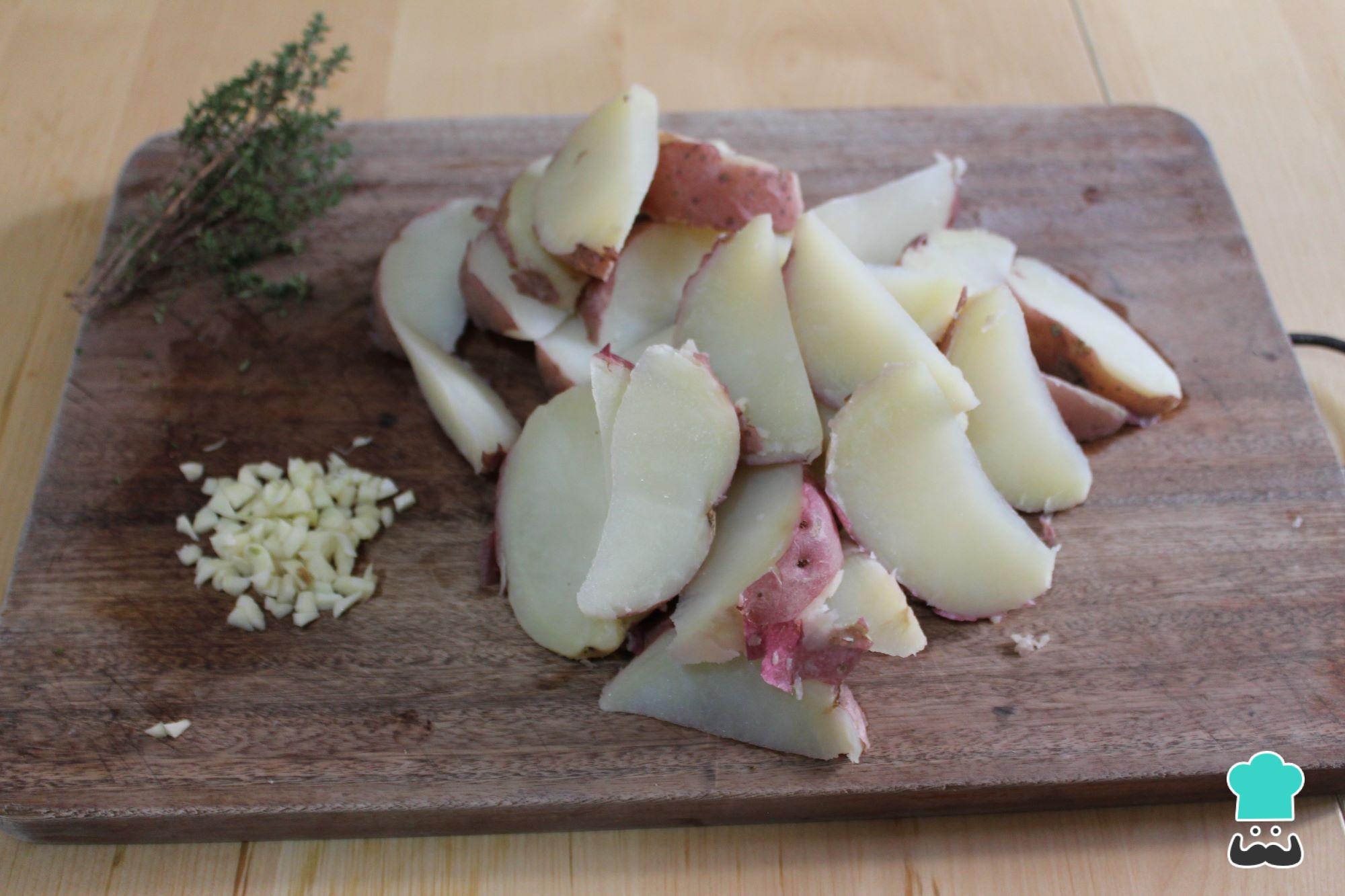 Escurre el agua y deja entibiar las papas para poder manipularlas. En este paso si te preguntas cómo cortar las papas rústicas, debes saber que primero se cortan las papas en dos y, seguido, debes hacer gajos gruesos. También pela los dientes de ajo y pica el tomillo fresco o retira simplemente las hojas, son las que usaremos para la maceración. Puedes utilizar tomillo seco si no tienes fresco.