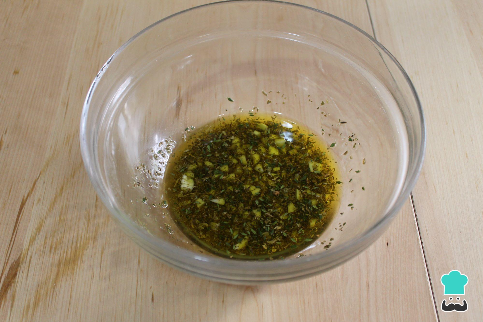 Pon en un bol amplio el aceite de oliva, el tomillo, el orégano y el ajo picado. Remueve bien.