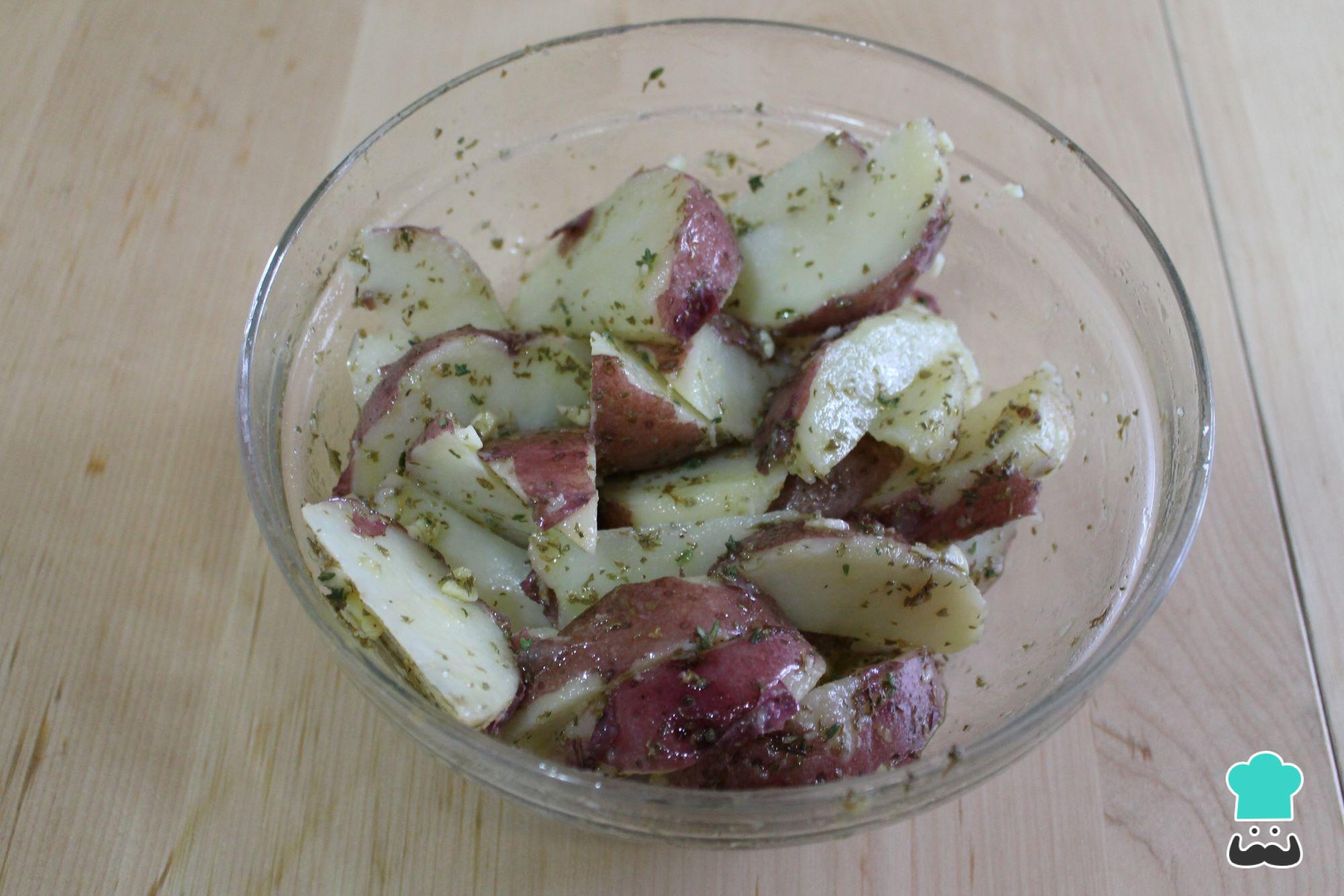 Introduce las papas en el líquido de la maceración y reboza bien con ayuda de una cuchara. Deja que maceren mientras precalientas el horno a 200 ºC.
