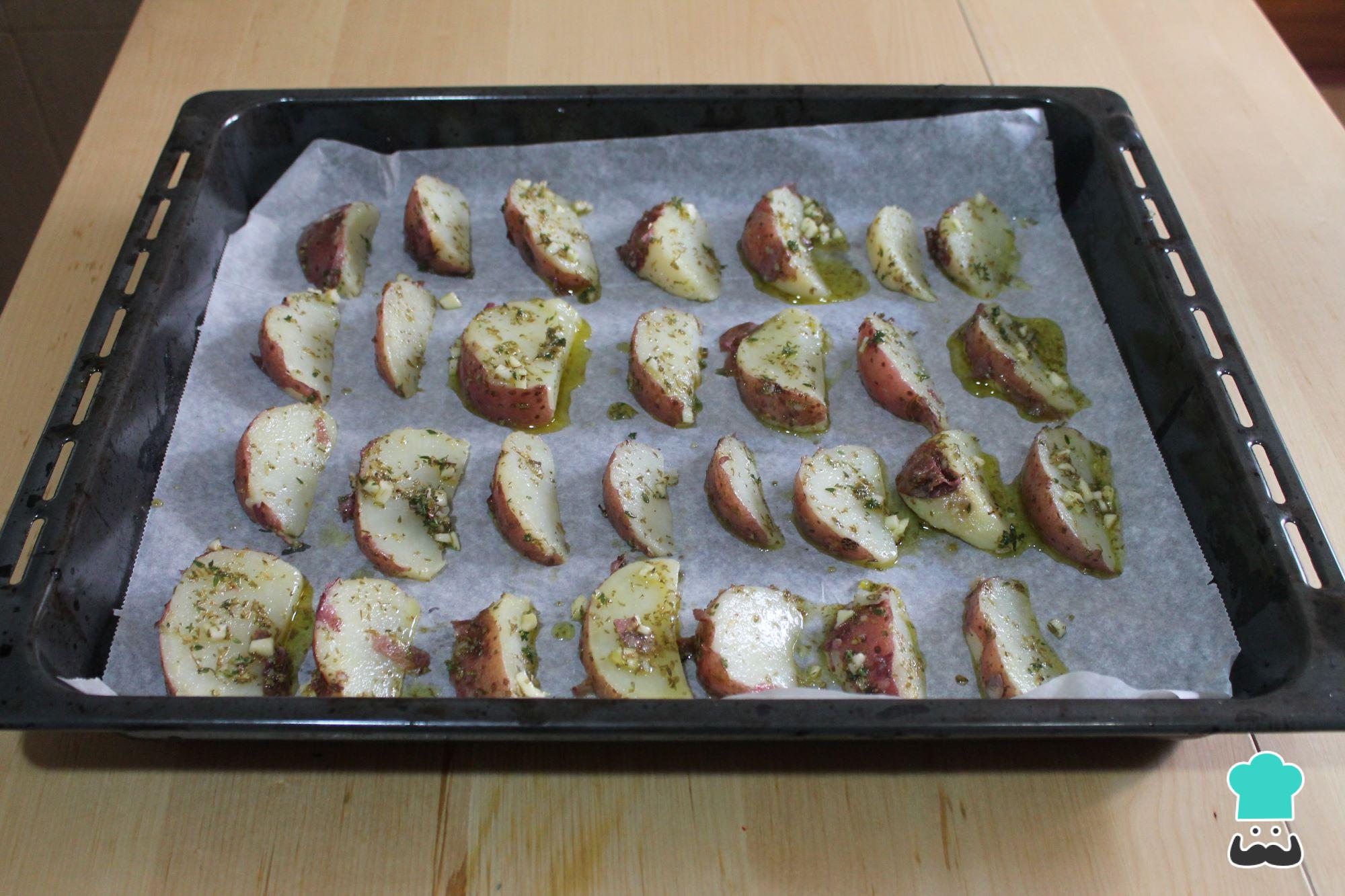 Una vez el horno esté bien caliente, forra una bandeja con papel y extiende los gajos de papa en ella. No los amontones para que se cocinen bien. Y, si te sobra líquido de la maceración, puedes pincelar las papas con el líquido sobrante. Hornea con calor arriba y abajo a 200 ºC durante 18-20 minutos o hasta que estén doraditas. ¿Qué te están pareciendo estas papas al horno condimentadas?