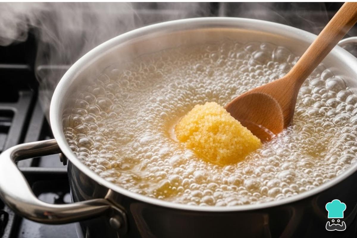En una olla mediana, hierve 500 ml de agua. Una vez que rompa el hervor, añade el papelón rallado o picado. Remueve constantemente hasta que se disuelva completamente, formando un almíbar dorado. Así es cómo se hace el papelón base para la bebida.
