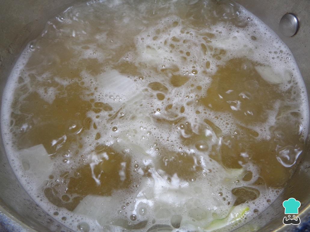 Para comenzar vamos a cocinar nuestra pasta: para esto la colocamos en una cacerola con abundante agua hirviendo y añadimos un diente de ajo, un trozo de cebolla, un poco de aceite y una pizca de sal, y dejamos que se cueza por aproximadamente 5 minutos. Una vez se sienta suave la pasta la retiramos del agua caliente y la reservamos un momento.