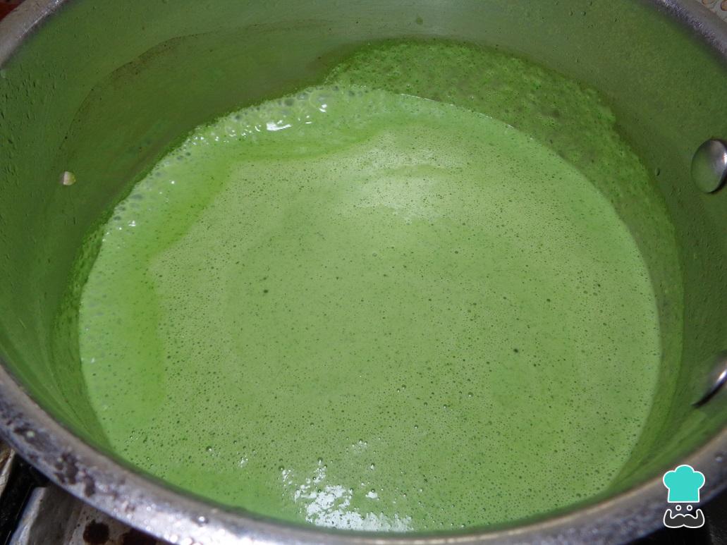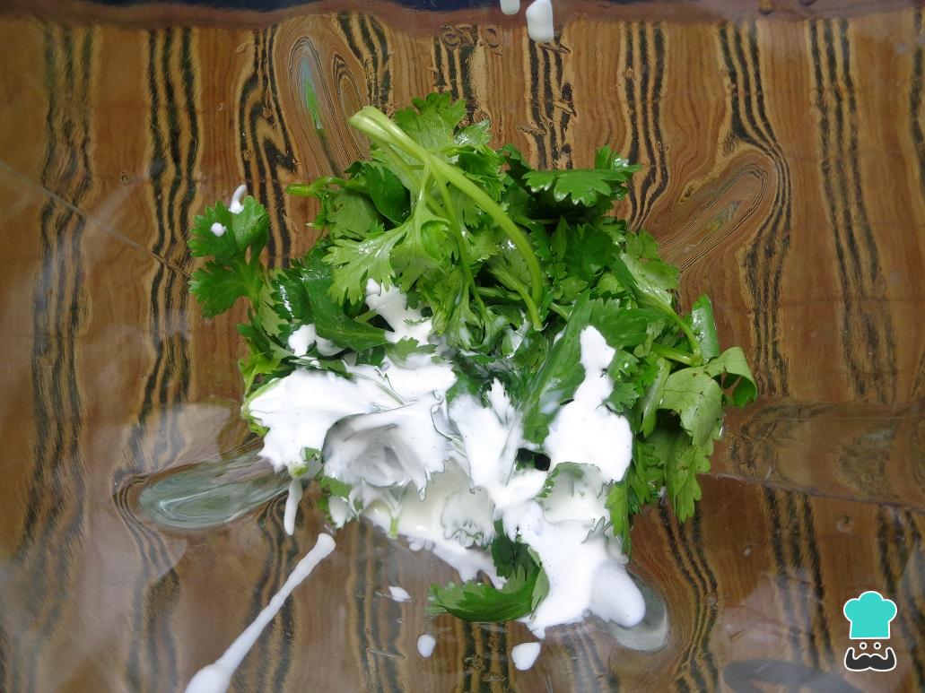 Ahora en la licuadora colocamos la crema, la leche, el ajo, la cebolla, el consomé de pollo en polvo y el cilantro, licuamos hasta obtener una salsa homogénea.