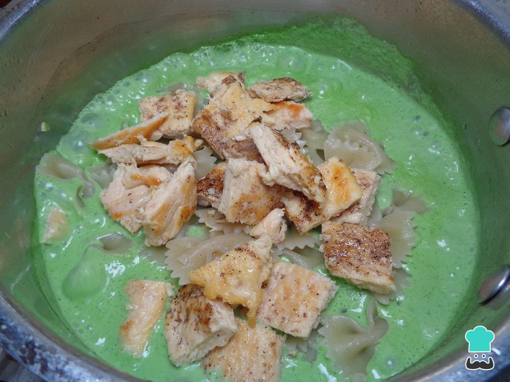 Una vez la salsa se torne espesa añadimos a esta la pasta y los cubos de pollo, e integramos perfectamente.