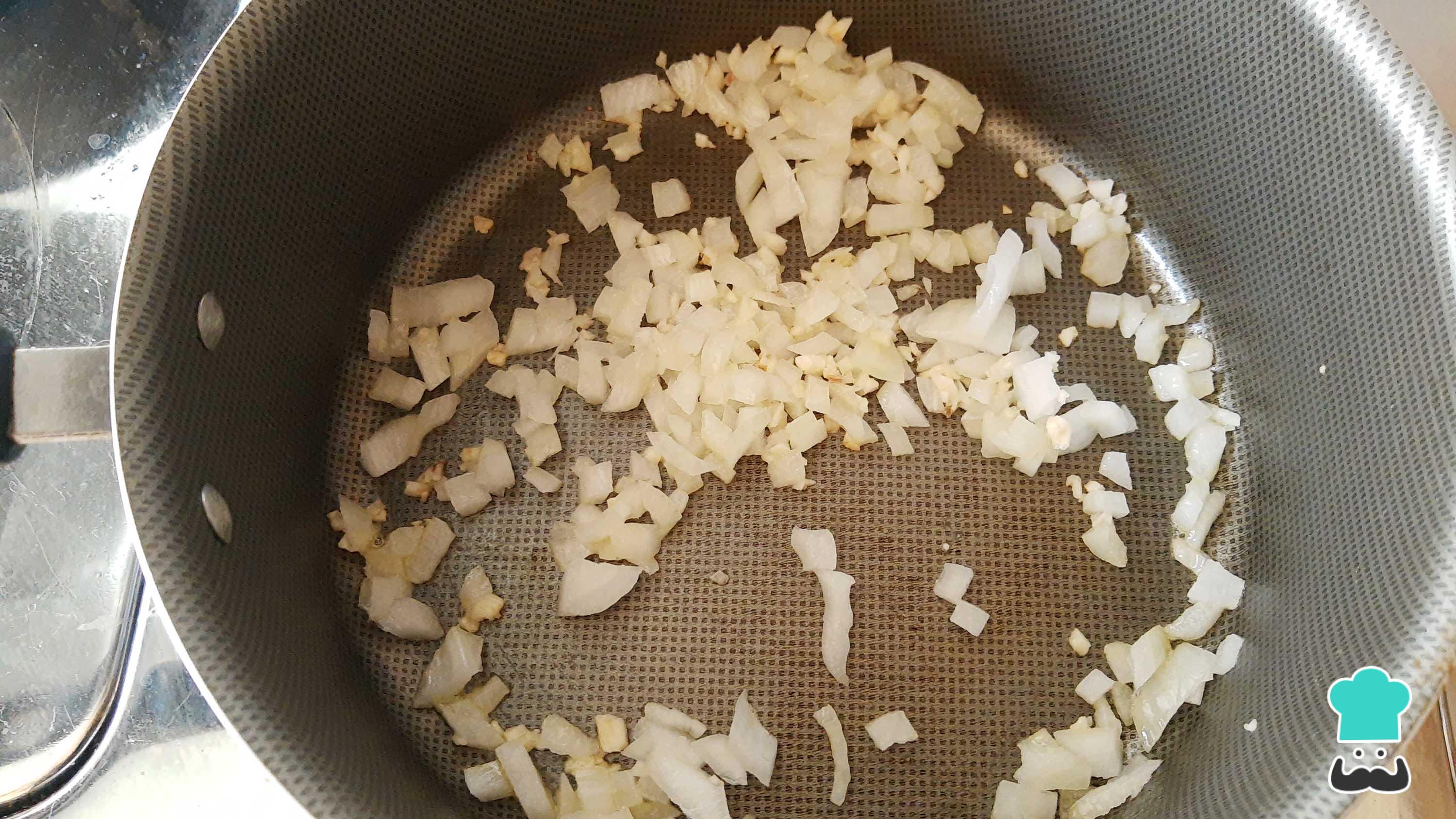 En una olla añade una cucharada de aceite de oliva, acitrona la cebolla y el diente de ajo picado.