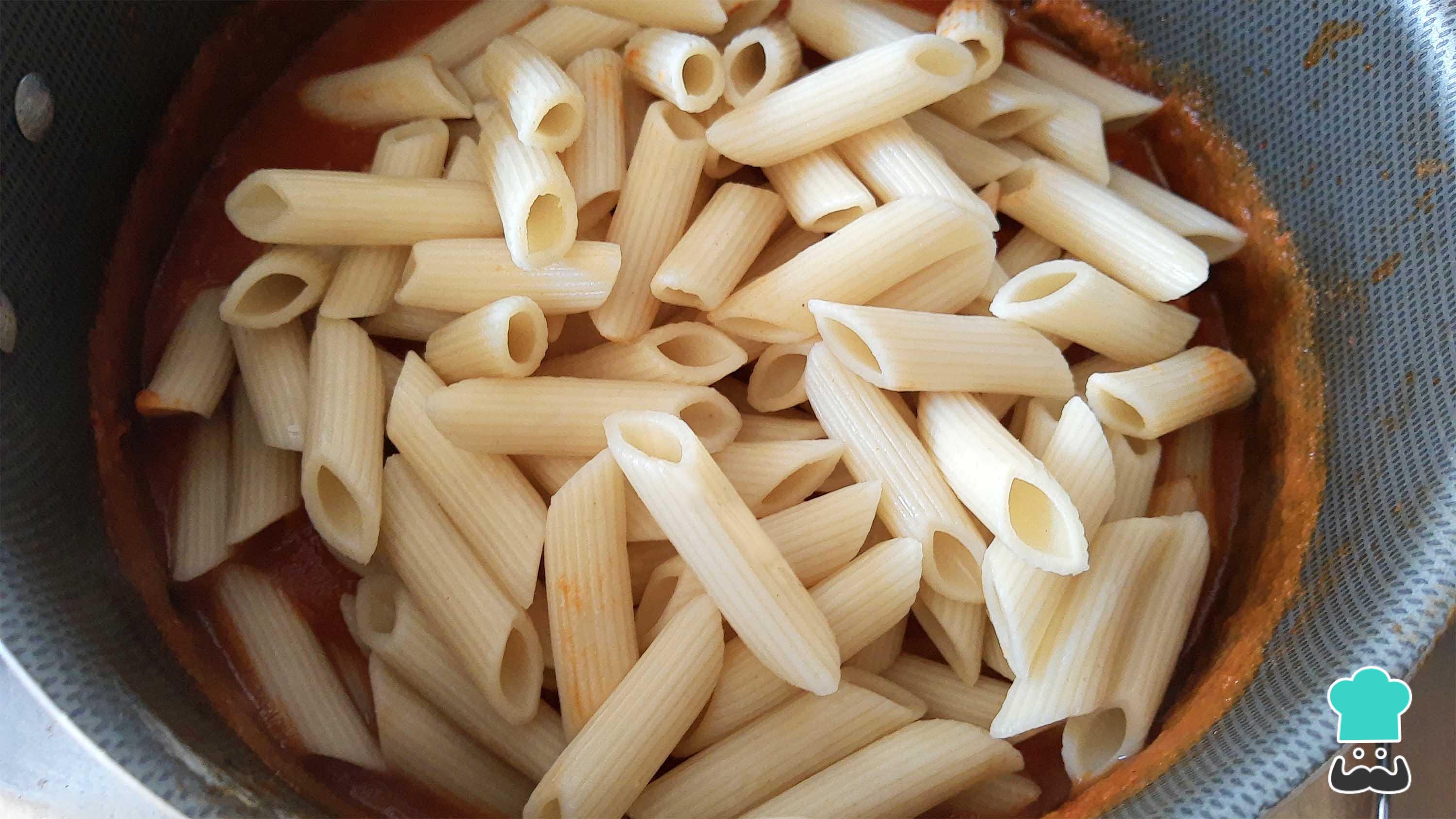 Con la salsa pomodoro lista, es momento de agregar la pasta cocida, apagar el fuego y mezclar hasta que se integre bien la salsa con la pasta. ¡Ya casi está lista la receta de pasta al pomodoro fácil!