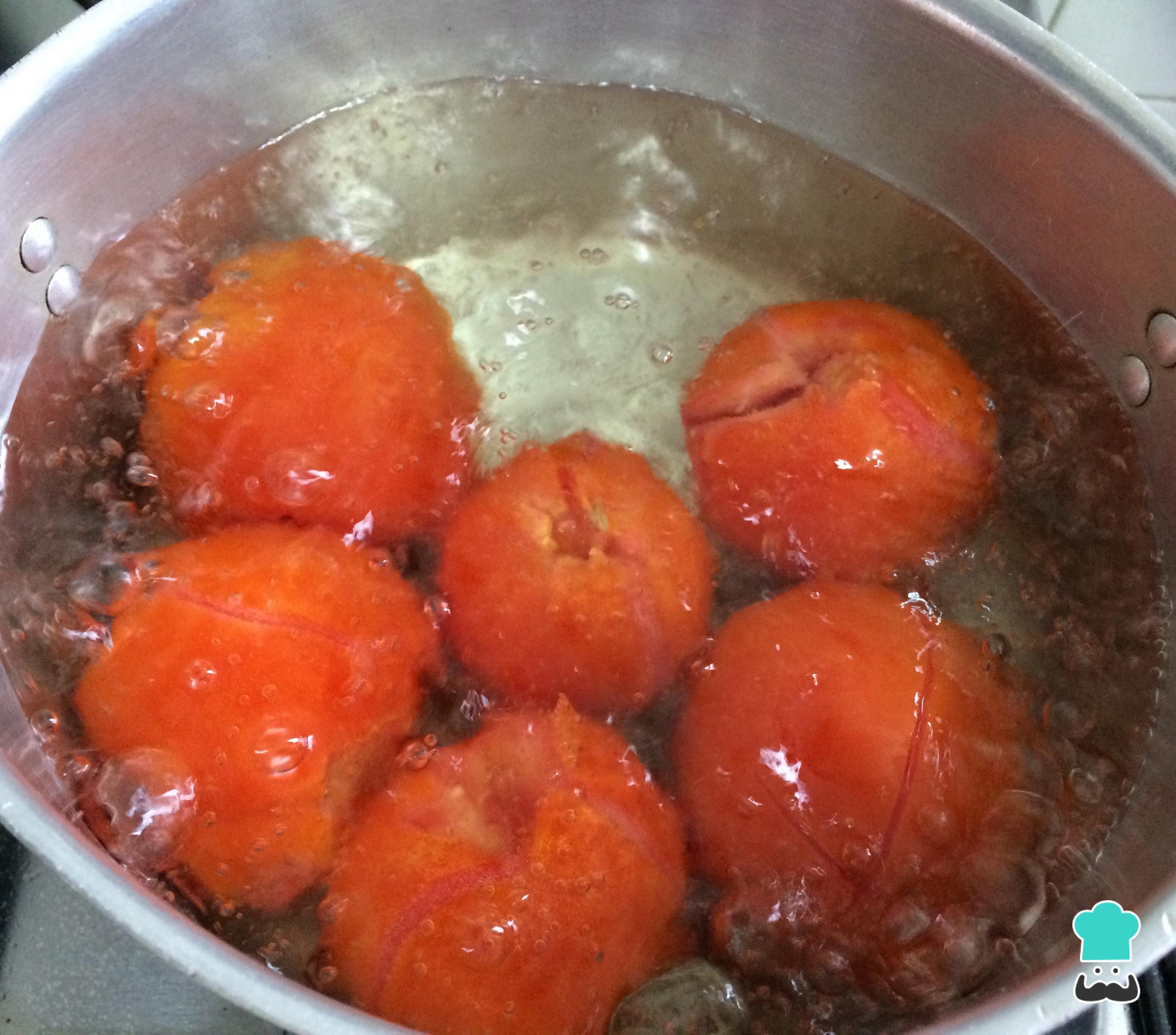 En una olla con abundante agua, añadir los tomates sin pedúnculo y hacer una cruz en un extremo. Cocinar 5 minutos y retirar la piel, una vez estén listos licuar los tomates con sal y pimienta.