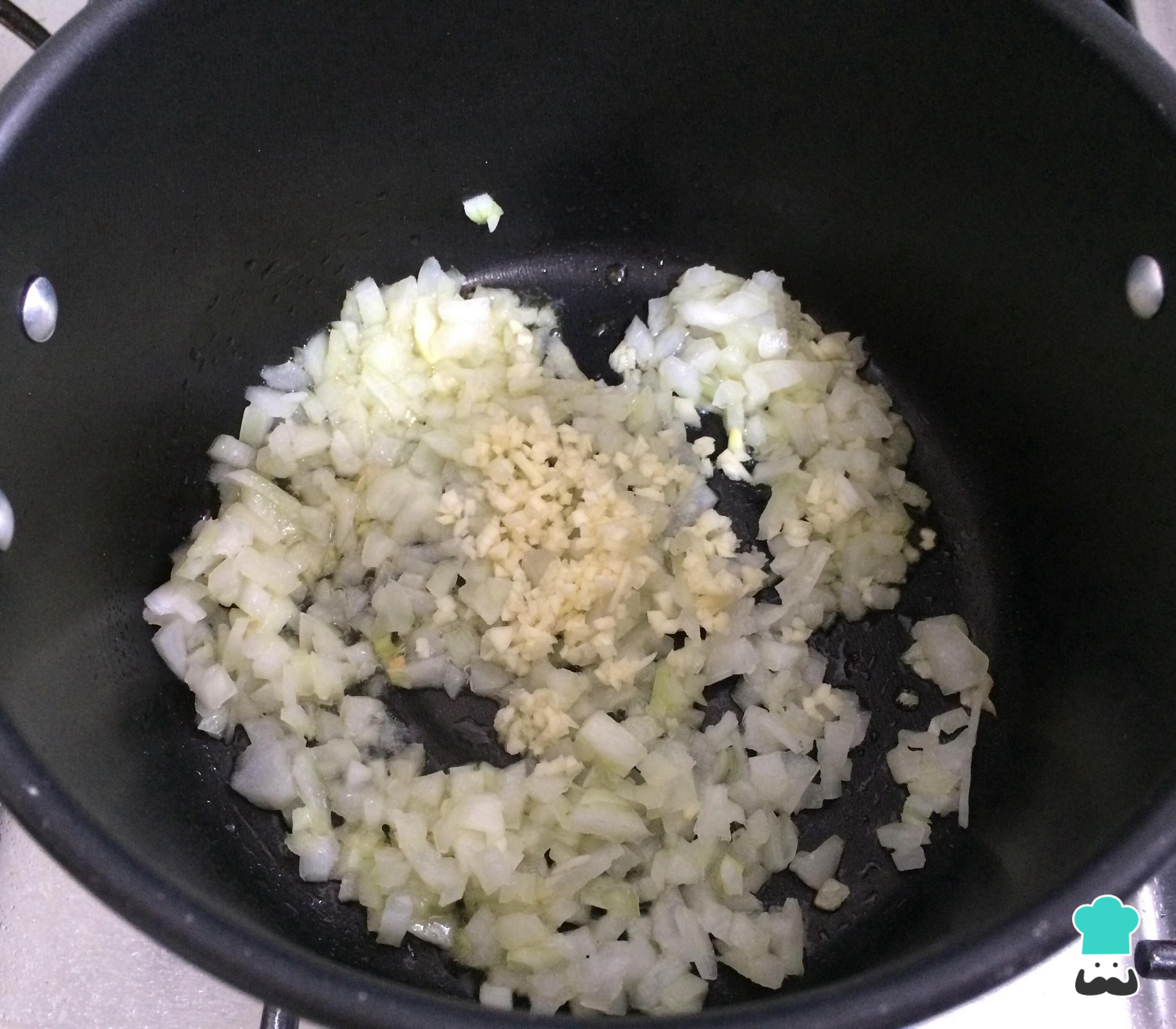En una olla con aceite sofreír la cebolla y el ajo cortado finamente hasta que esté blando.