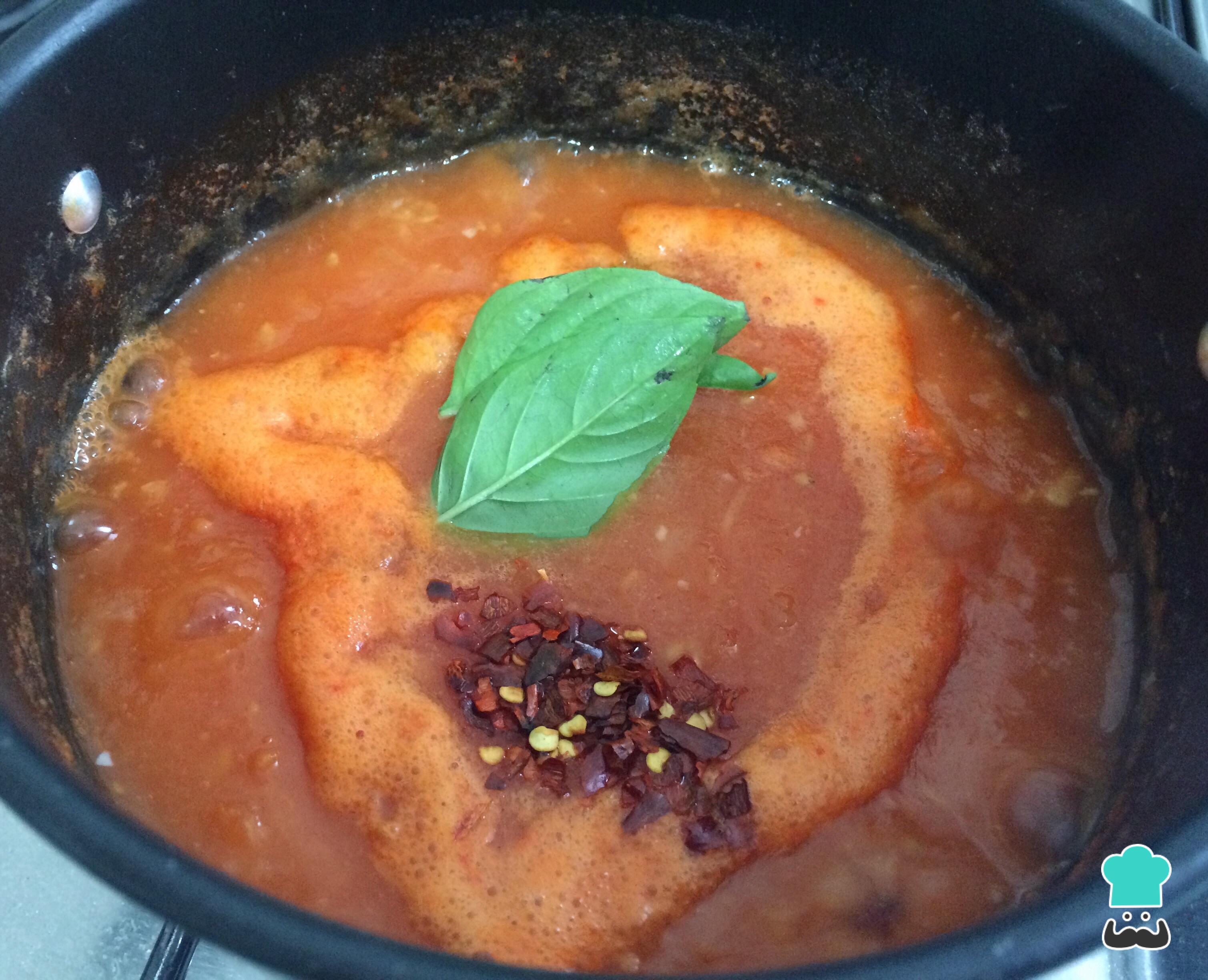 Agregar el jugo del tomate, el pimiento picante seco y la albahaca, cocinar durante 20 minutos a fuego bajo. Rectificar sabor con sal y pimienta si es necesario.