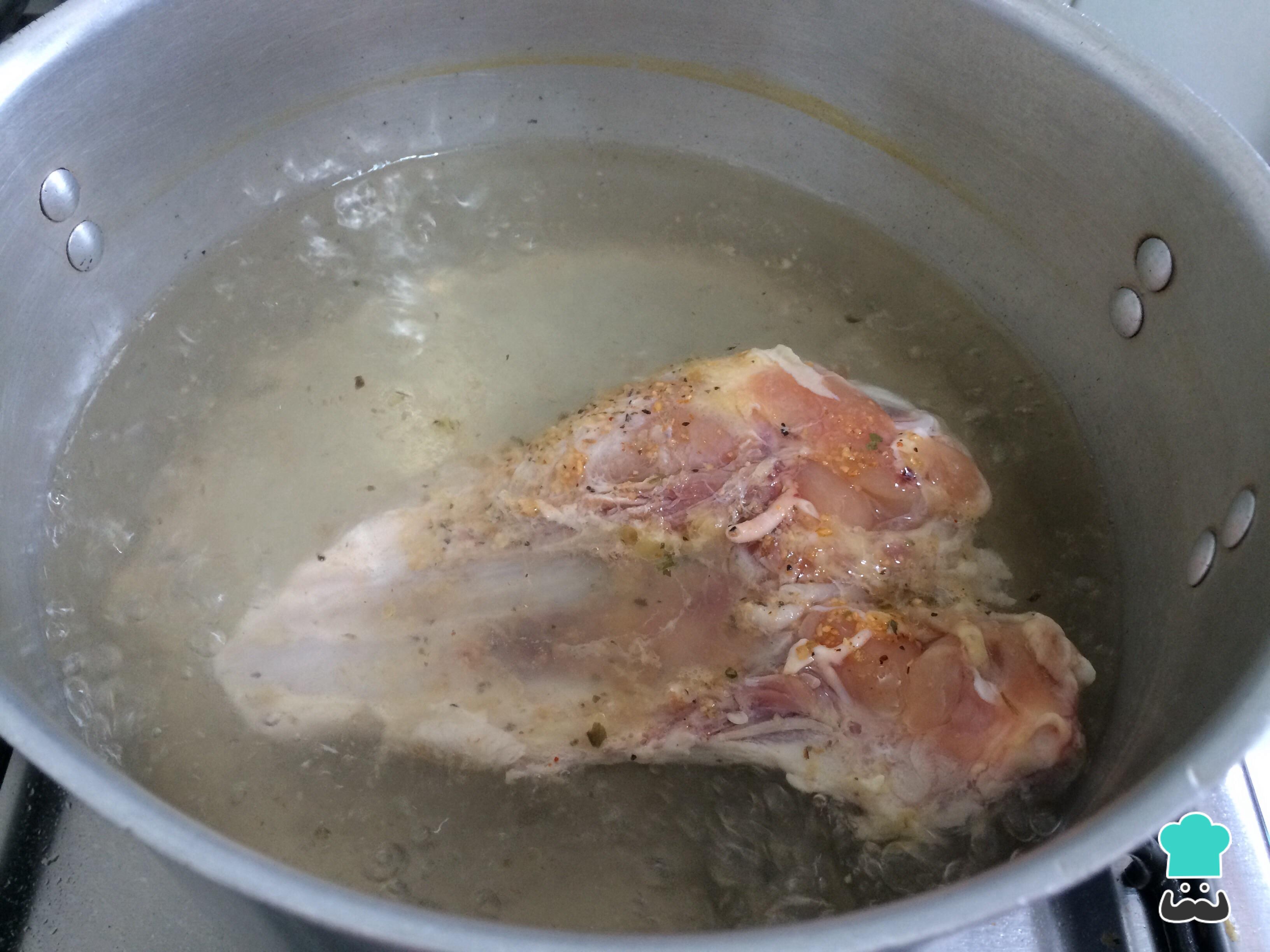 Aparte, en una olla con agua, cocinar la pechuga de pollo durante 25 minutos. Condimentada con el sazonador de pollo, sal y pimienta, desmenuzar la pechuga de pollo.