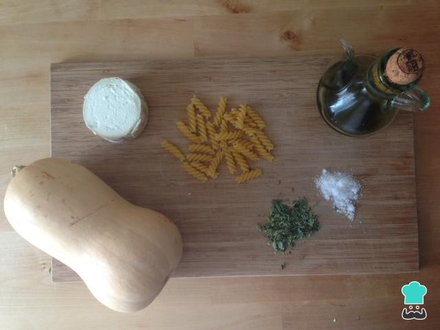 Reunimos todos los ingredientes para elaborar la pasta con calabaza y queso de cabra.