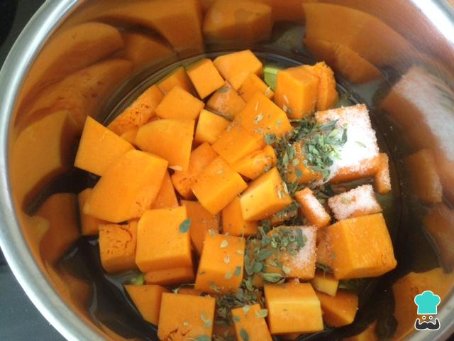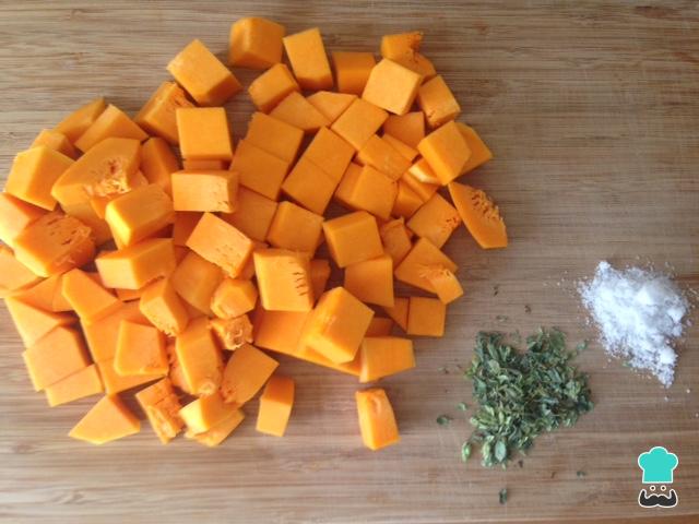 En primer lugar pelamos la calabaza y la troceamos en cuadraditos de tamaño mediano.