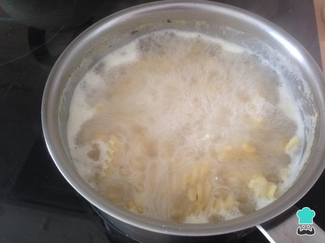 Por otra parte, cocemos la pasta en abundante agua hirviendo con un poco de sal. En este caso hemos utilizado fusilli, pero podéis usar cualquier otra pasta corta que os guste. Cuando esté lista, escurrimos dejando un poco del agua de la cocción.