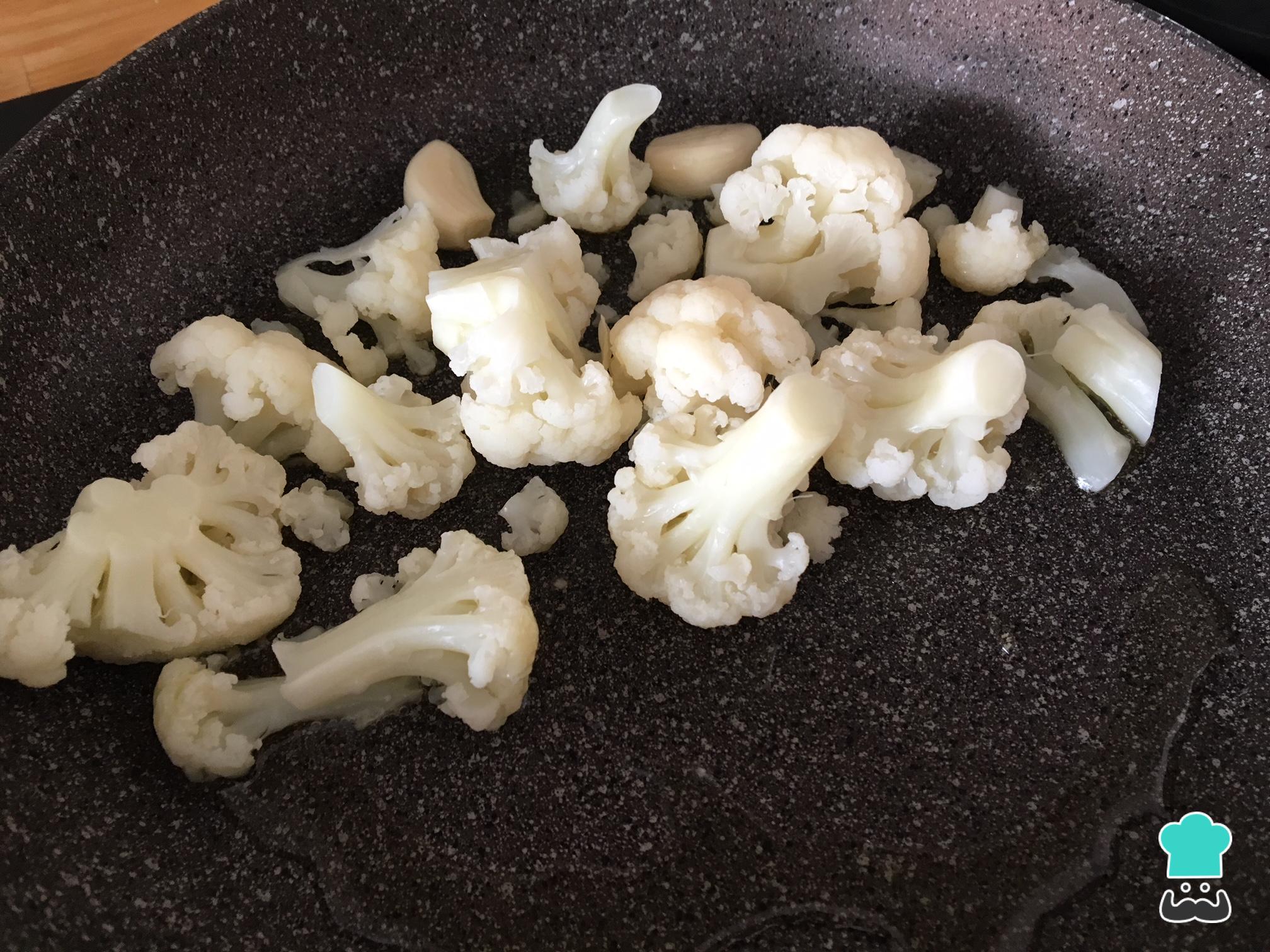 En una sartén, salteamos los ajos pelados junto con la coliflor cocida y 4 cucharadas de aceite de oliva. Dejamos que se doren los ajos y la coliflor durante 3 minutos.