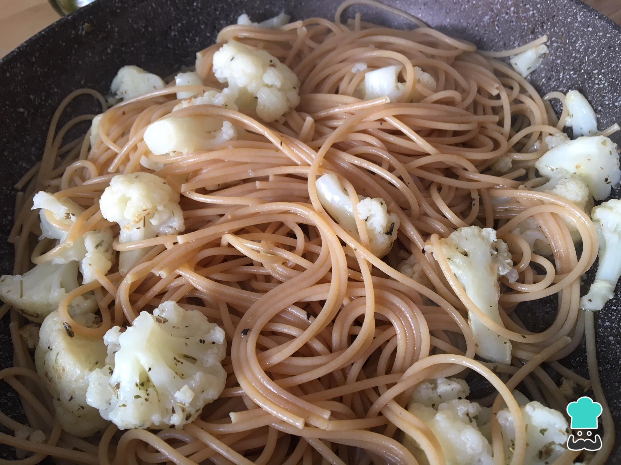Una vez cocidos, añadimos los espaguetis a nuestro sofrito de coliflor con hierbas y removemos para que se integren con el aceite y el resto de sabores. Si quieres, puedes poner 2 cucharadas del agua de cocción de la pasta para que quede más jugosa.
