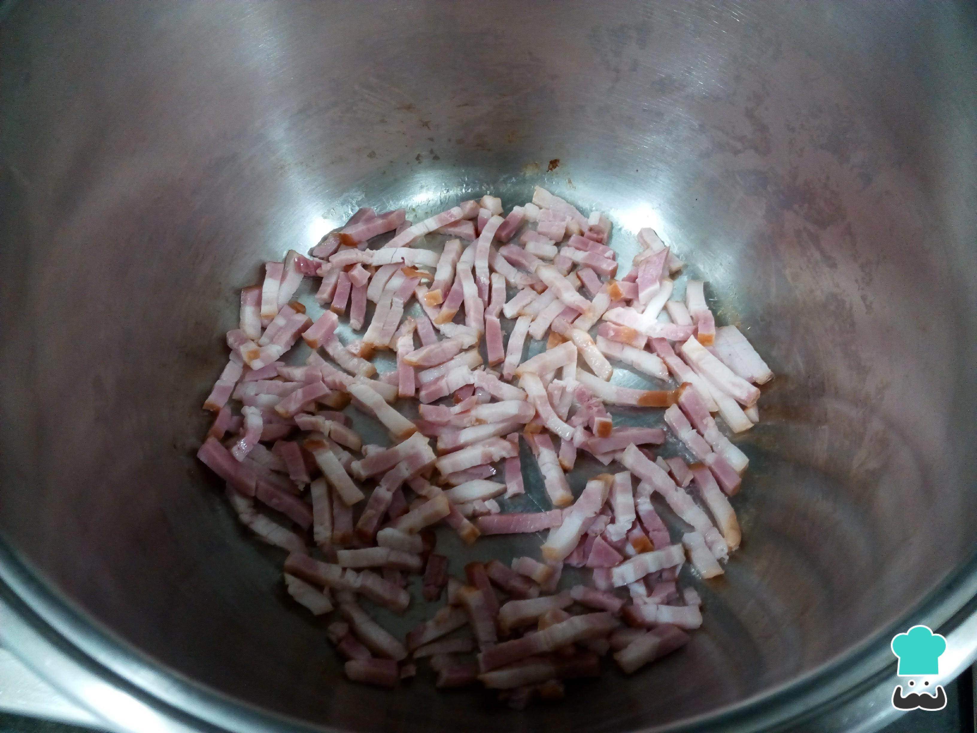 Lo primero que tenemos que hacer para preparar esta deliciosa pasta con pollo al pesto es freír el bacon cortado en tiras en una olla o cazuela honda, porque vamos a ir haciendo todo el plato en ese mismo recipiente.