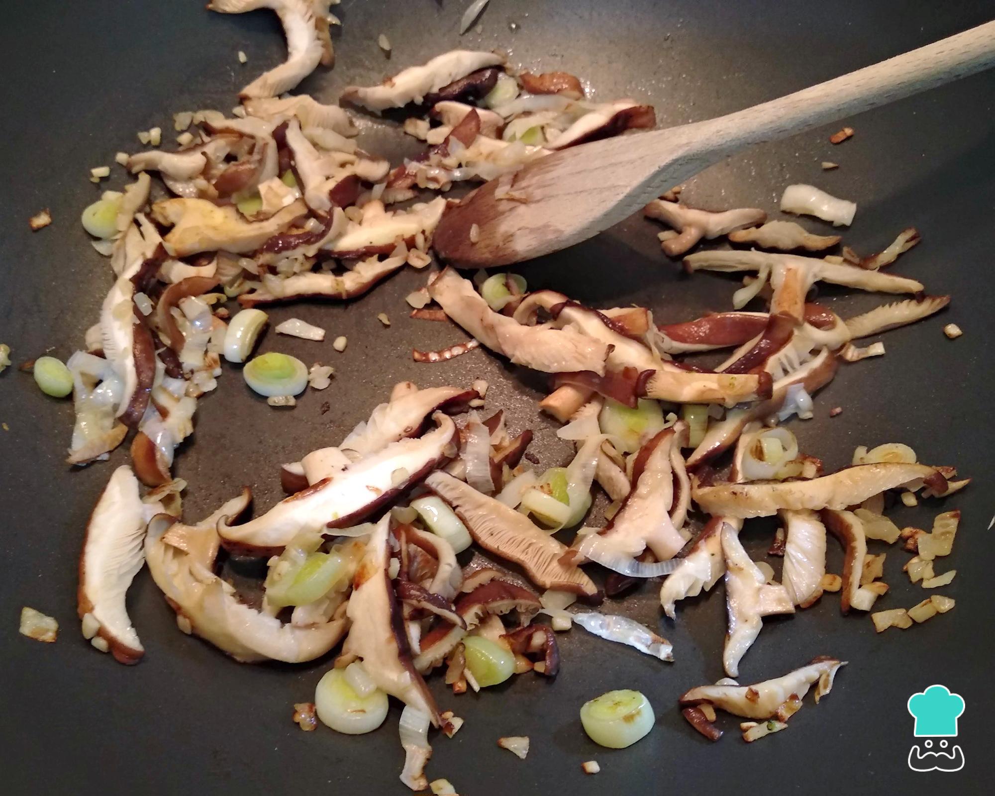 Calienta en una sartén un chorro de aceite de oliva. Cuando esté caliente, saltea el puerro picado y las setas shiitake troceadas. Cocina durante 2-3 minutos a fuego medio. Si usas shiitake en conserva también deberás cortarlas y saltearlas, mientras que si empleas shiitake deshidratadas primero tendrás que hidratarlas en agua.