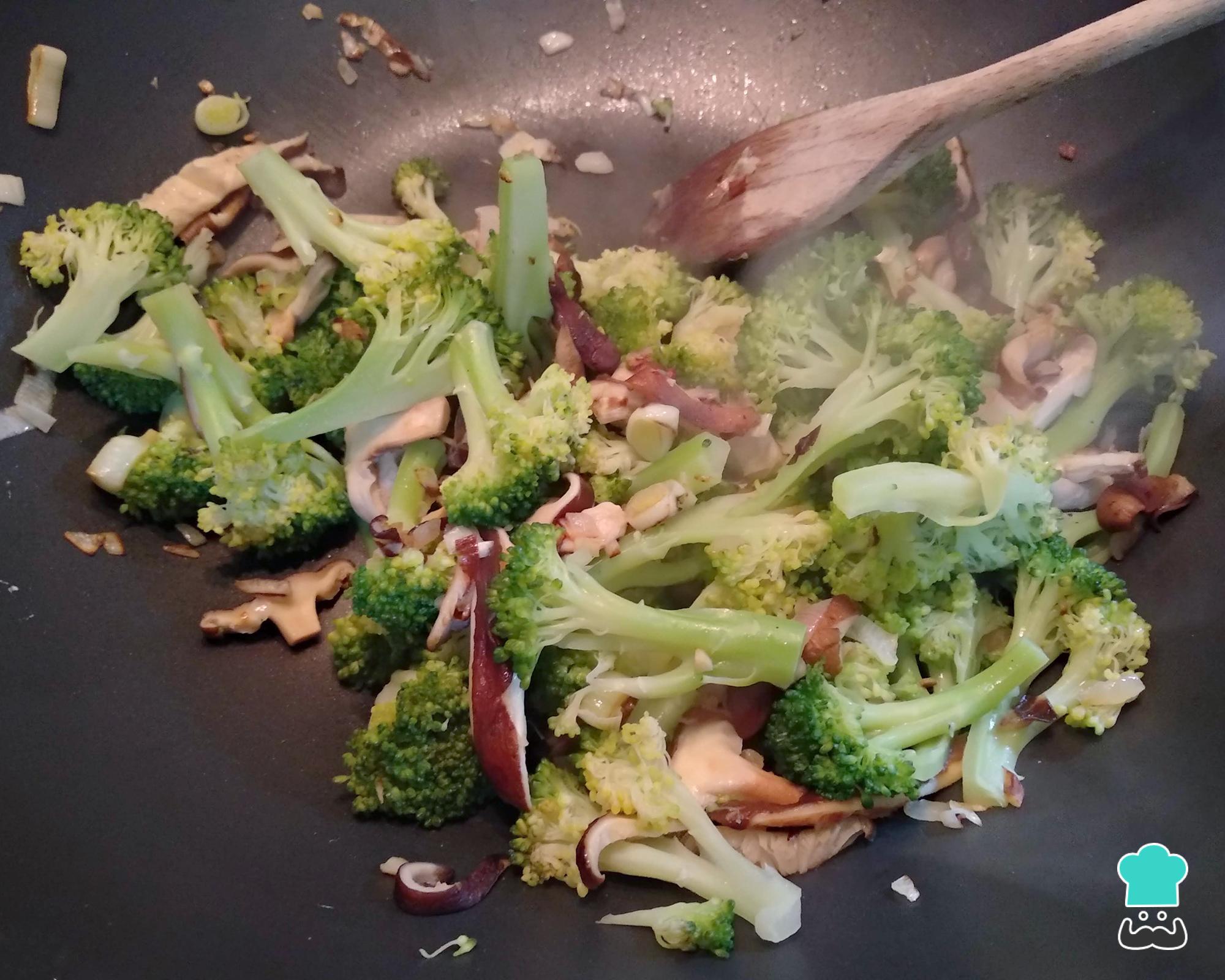 Añade el brócoli cocido, mezcla con el puerro y las setas y sigue cocinando. Nosotros hemos hecho el brócoli al vapor con una pizca de sal y lo hemos cortado, pero también podrías hervirlo en agua o cocinarlo al horno.