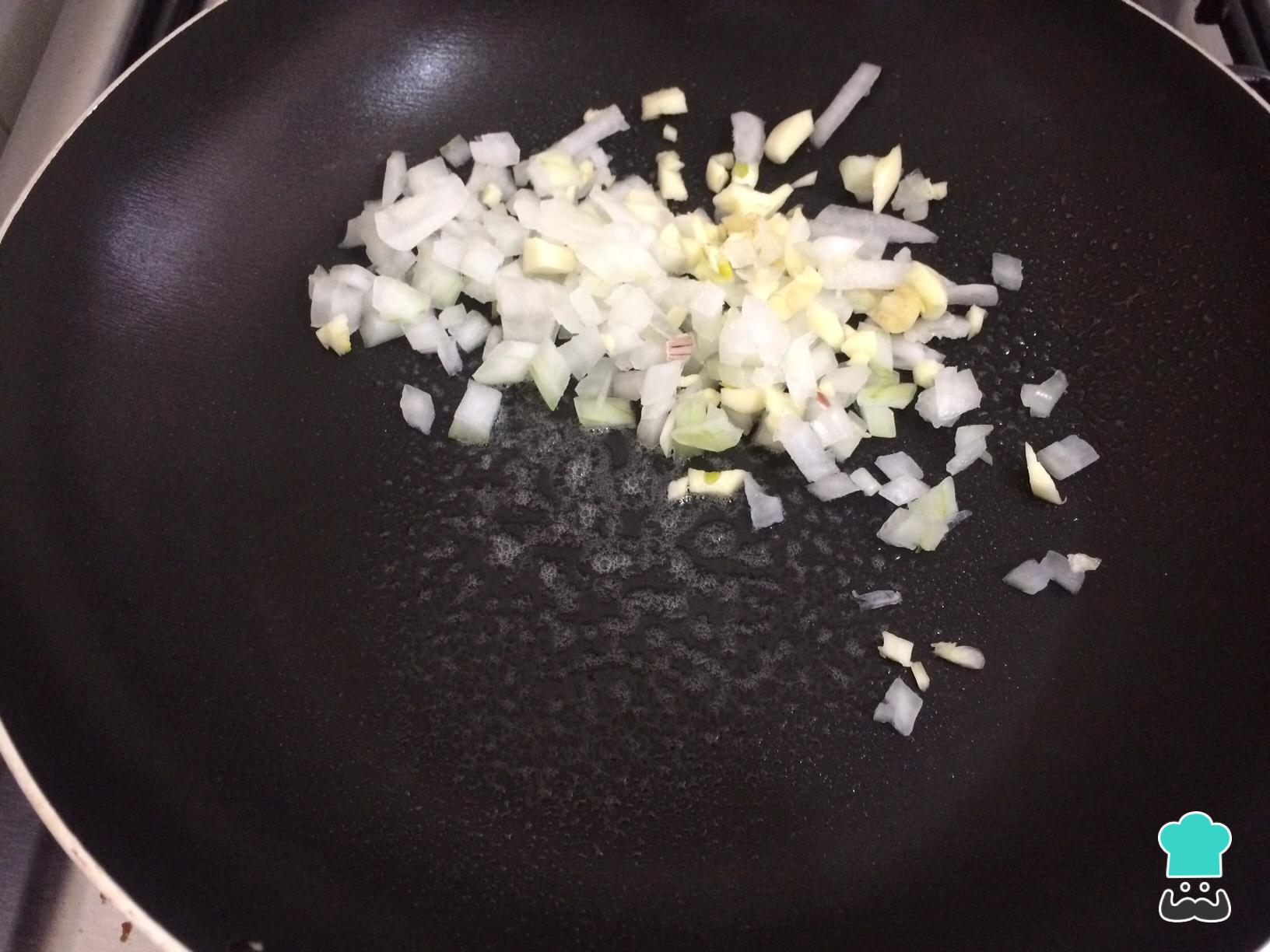 En una sartén sofreír la cebolla y el ajo cortados en cubos pequeños hasta que estén dorados.