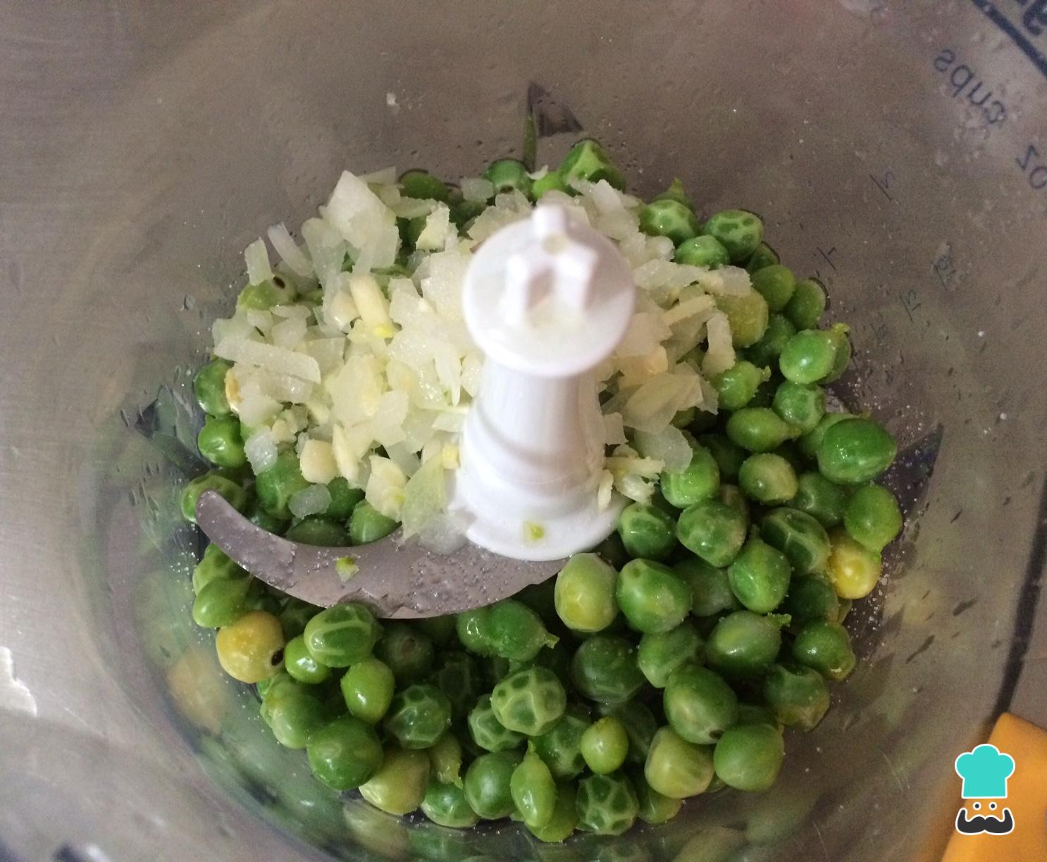 En un procesador, licuar las arvejas previamente cocidas, con la cebolla, el ajo y un poco de agua de la cocción de las arvejas.