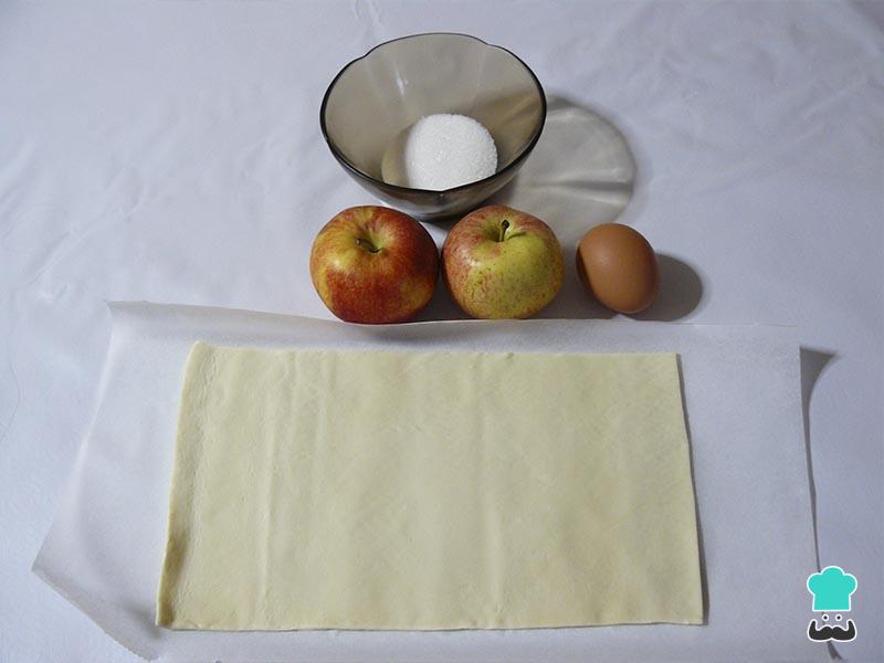 Alistamos los ingredientes con los que vamos a preparar nuestra pasta de hojaldre de manzana: media placa de masa de hojaldre, dos manzanas, azúcar para caramelizar parte de las manzanas, y el huevo. También ponemos a calentar al horno a 150 grados.