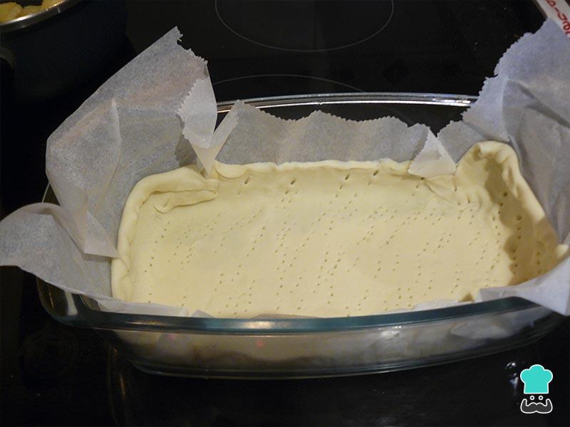 Se estira la masa del hojaldre sobre papel para horno con la ayuda de un rodillo. Una vez estirada, se coloca sobre el recipiente en el que vamos a cocerla en el horno. Hay que cubrir bien los laterales del molde para que el aire no entre y suba la masa. Para que las masas de hojaldre no suban se les pica con un tenedor.