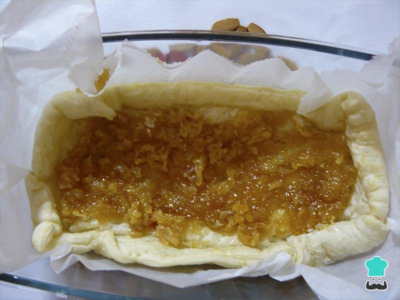 Cuando el hojaldre esté cocido, lo sacamos del horno con cuidado para no quemarnos. Extendemos sobre el hojaldre el relleno de manzana. No hace falta cubrirlo todo ni utilizar mucha cantidad.