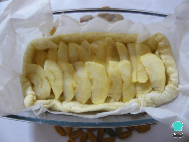 A continuación, cubrimos el hojaldre relleno de manzana caramelizada con las láminas de la manzana sobrante. Los colocamos como en capas. Lo introducimos de nuevo al horno, esta vez subiendo la temperatura a 180 grados durante 20 minutos.