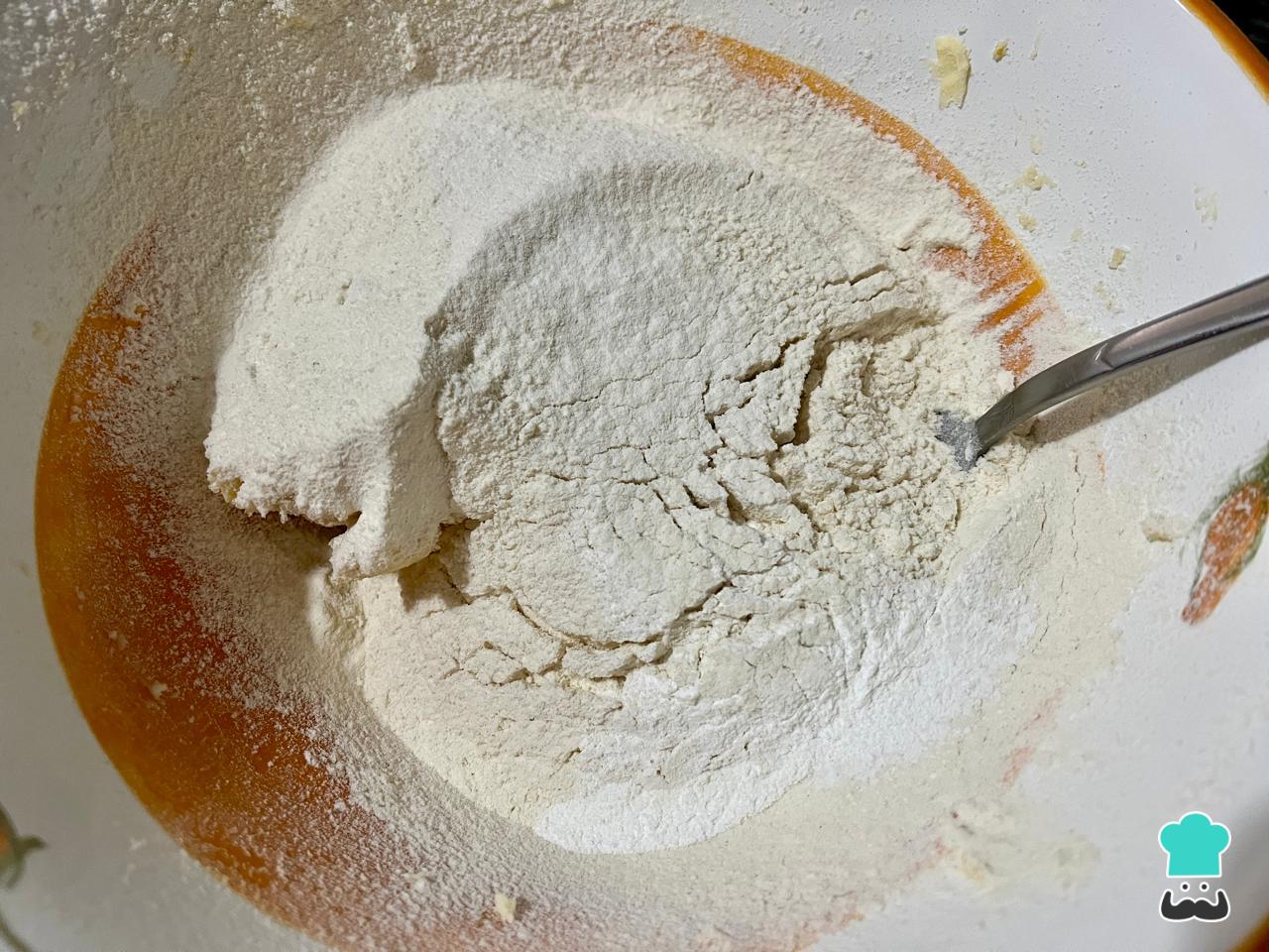 Cuando los ingredientes estén incorporados, agrega la harina leudante tamizándola previamente con un tamiz o colador fino. Si no tienes harina leudante, puedes utilizar 000 o 0000 junto con 1 cucharadita de polvo para hornear.