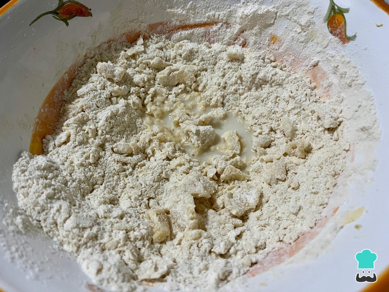 Añade la leche de a poco mientras integras sin amasar. Deberá quedar una masa ligeramente húmeda y blanda.