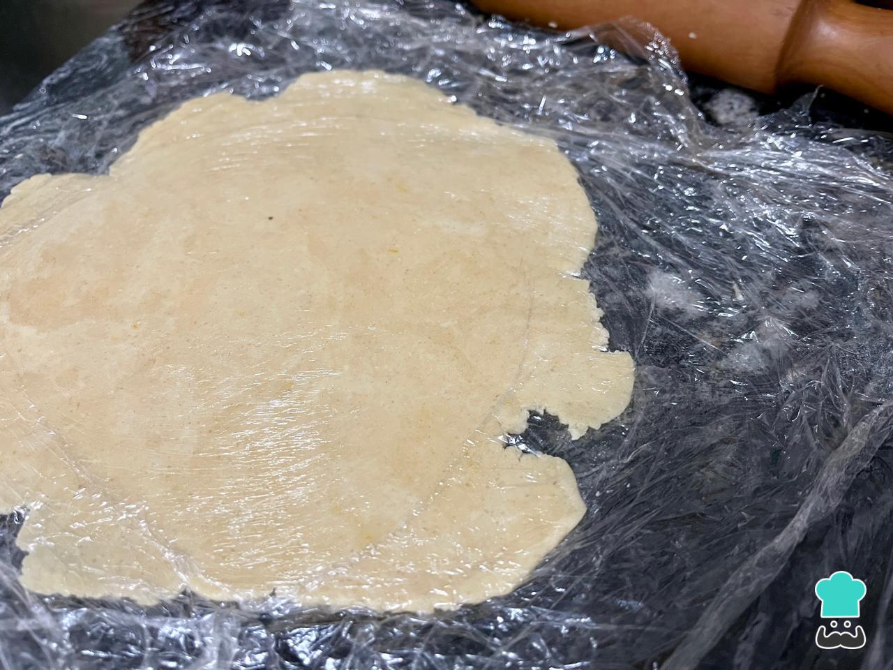 Cuando tengas la masa de tu pasta frola sin huevo lista, divídela en dos. Estira una de ellas entre papel film para evitar que se pegue a la mesada o al palote. Estírala de medio centímetro de alto y con ella cubre el molde donde cocinarás tu pasta frola, el cual debe ser desmontable y estar engrasado.