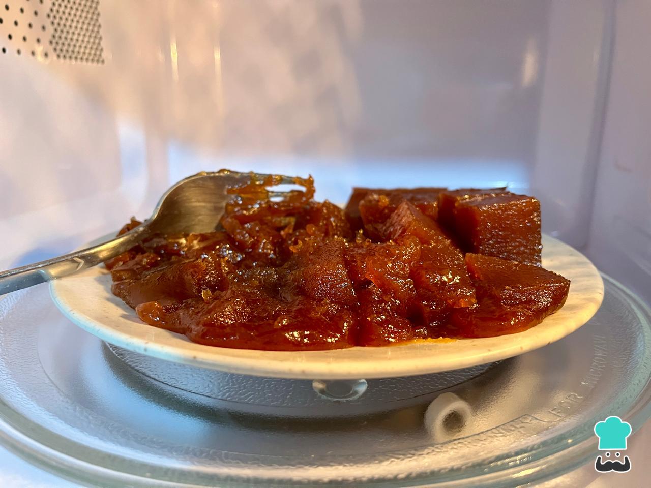 Derrite el dulce de membrillo en el microondas calentando de a 1 minuto. De esta forma, obtendrás un puré más fácil de distribuir que el dulce compacto.