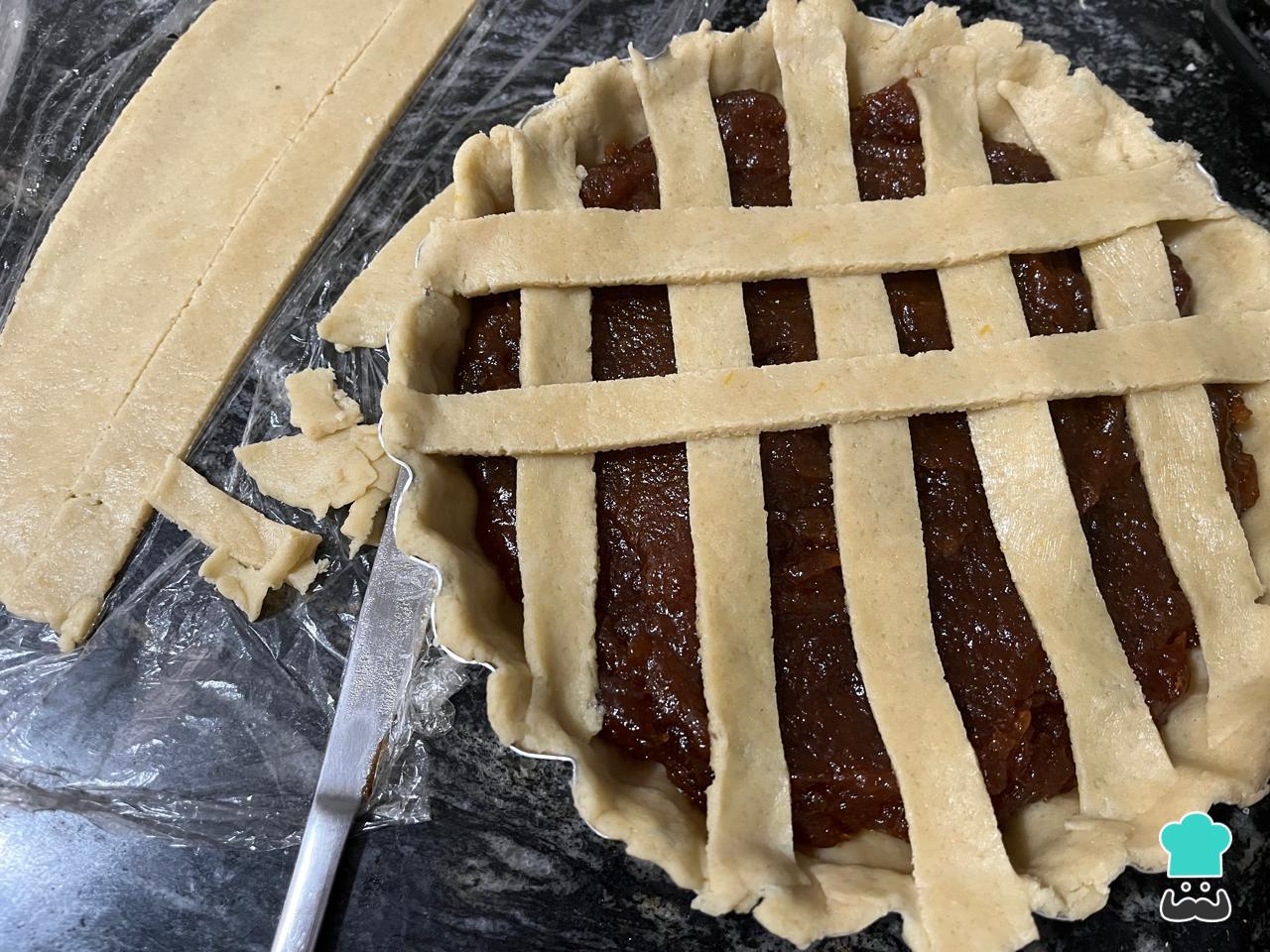Rellena con el dulce de membrillo y estira la mitad restante de la masa usando la misma técnica del papel film. Corta con ayuda de un cuchillo las tiras para hacer el enrejado de tu pasta frola. Ubícalas con aproximadamente 1 dedo de distancia y haz algo de presión en los bordes para que se pegue bien cada tira y los mismos queden prolijos, retirando el excedente.