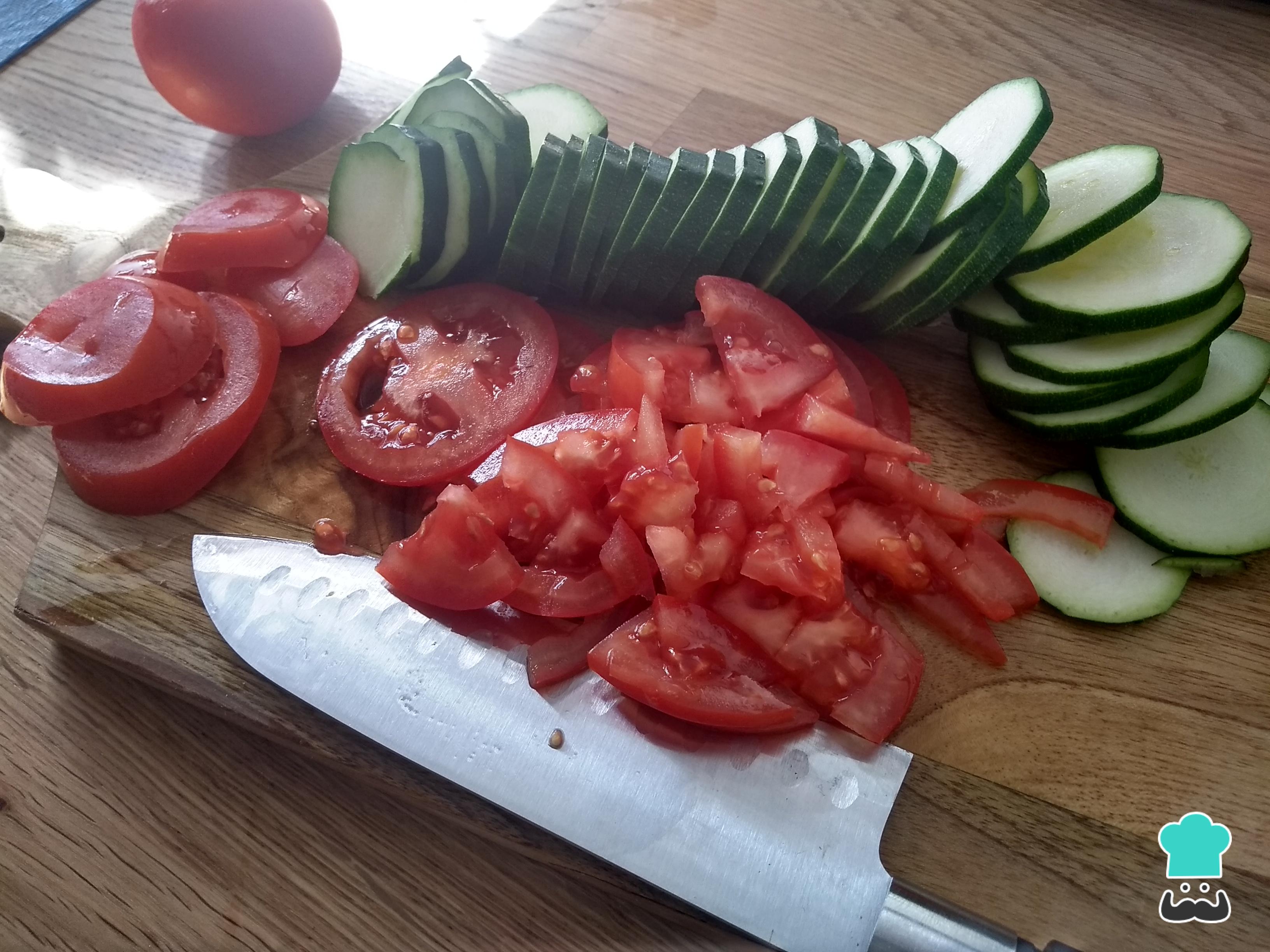 Lava y corta el calabacín en rodajas finas y el tomate en cubos medianos, aunque si no te gusta la textura del tomate también puedes rallarlo o triturarlo.