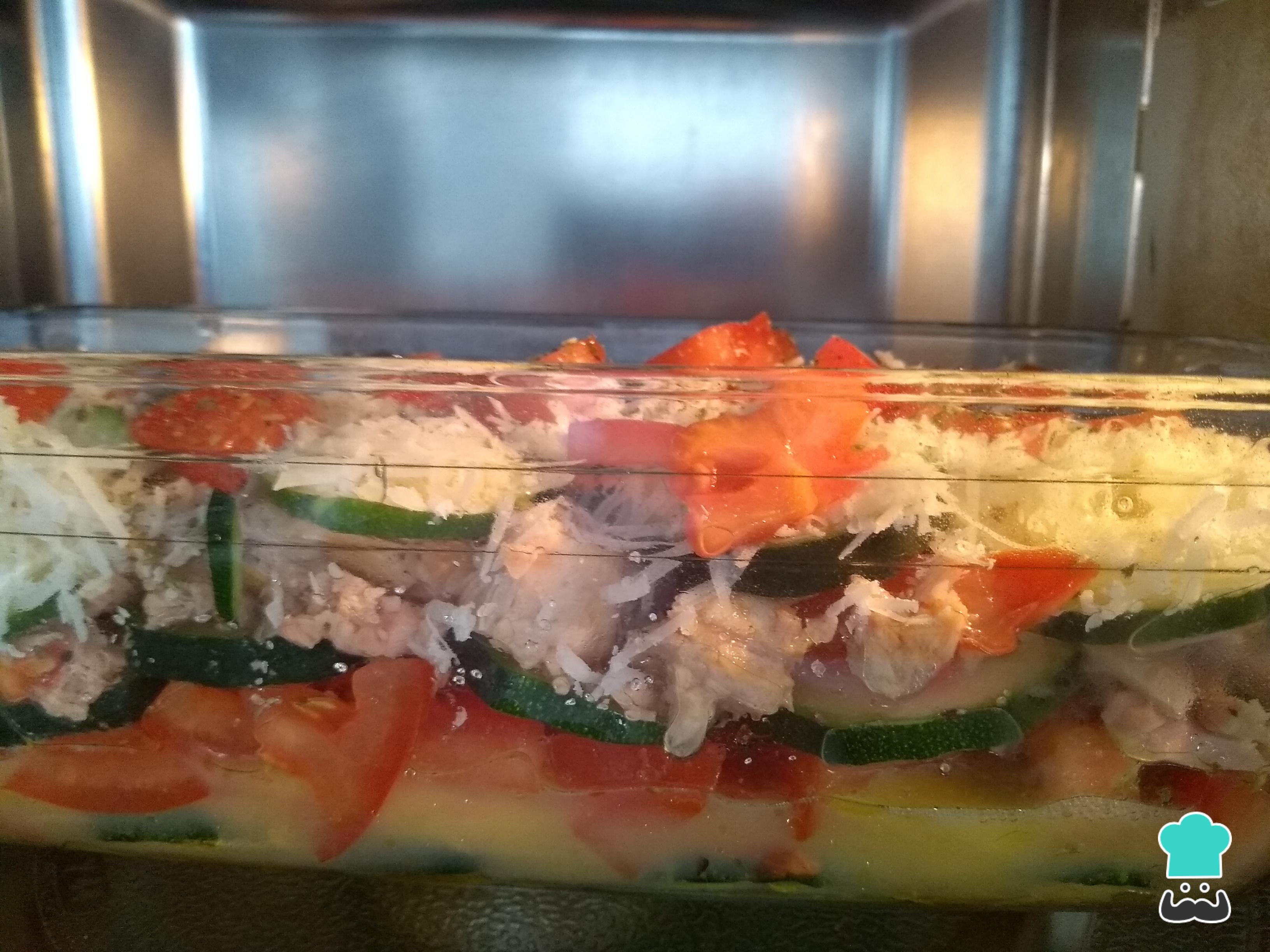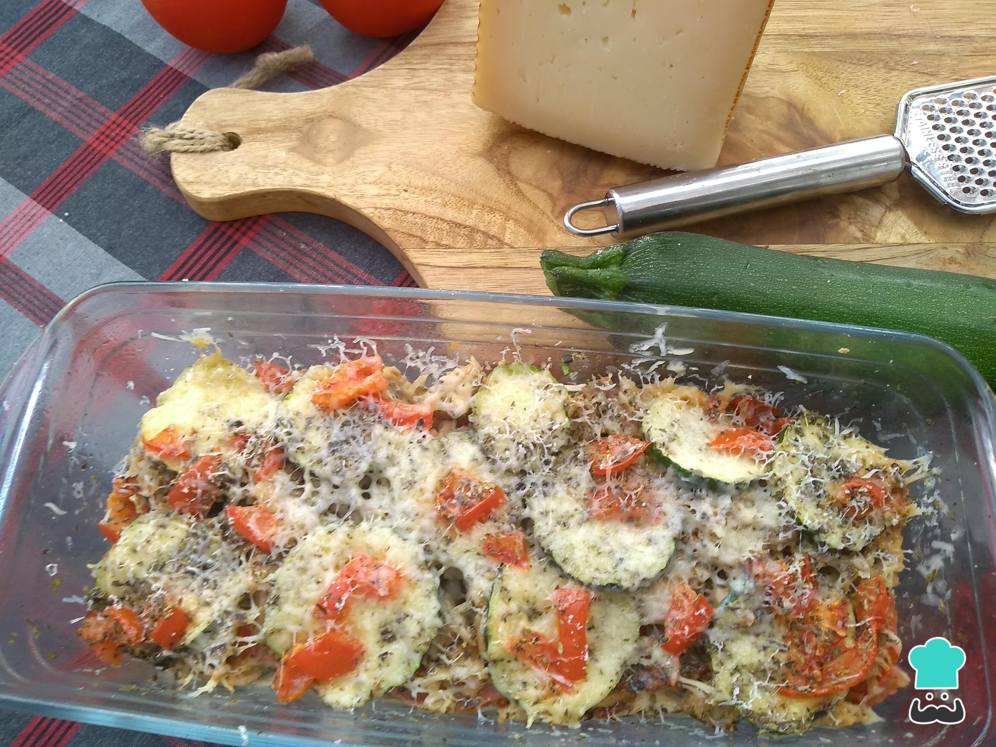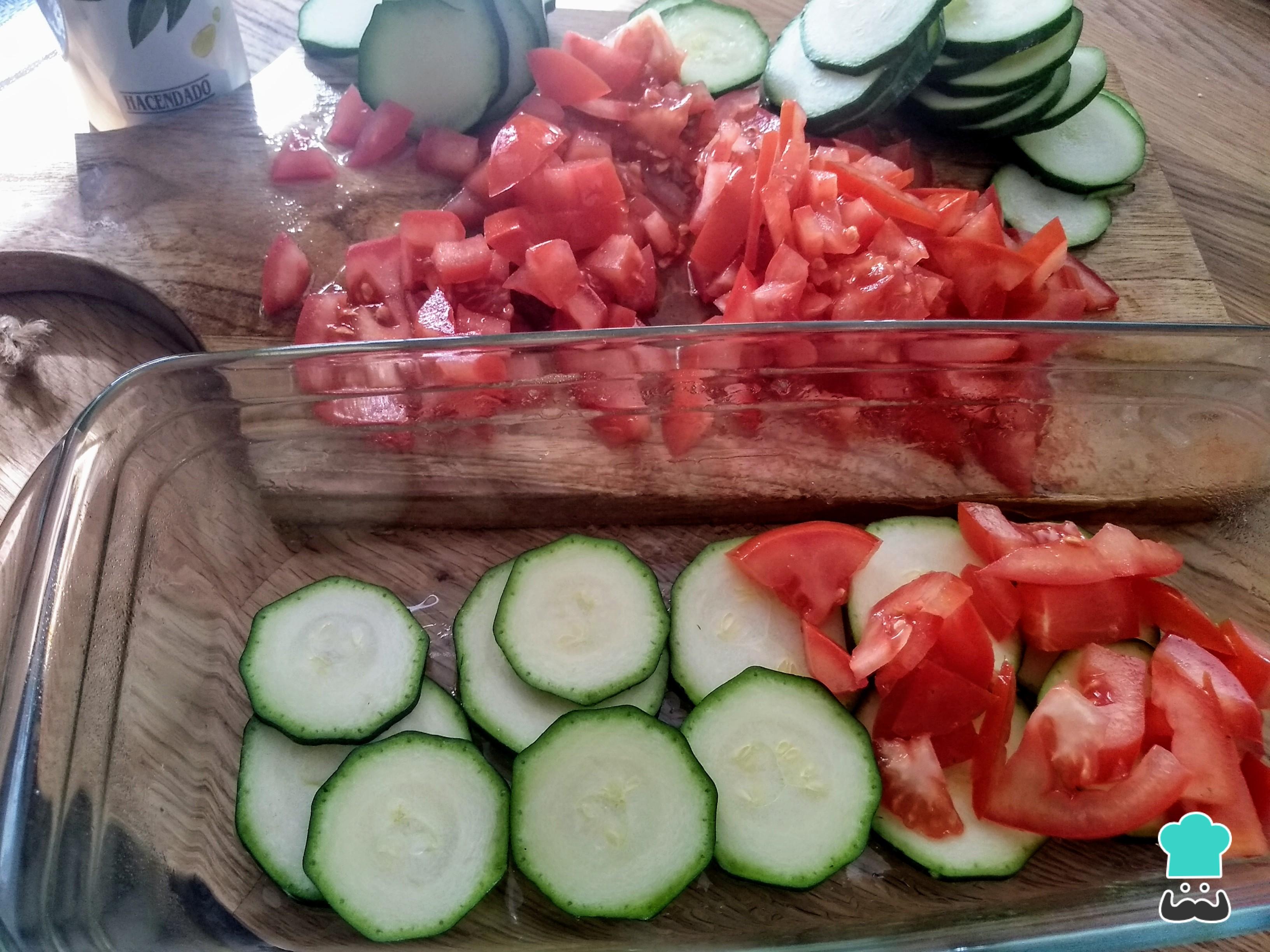Truco: Para no hacerlo en el horno, puedes cocinar a la plancha el calabacín y el tomate y hacer las capas siguiendo las instrucciones.