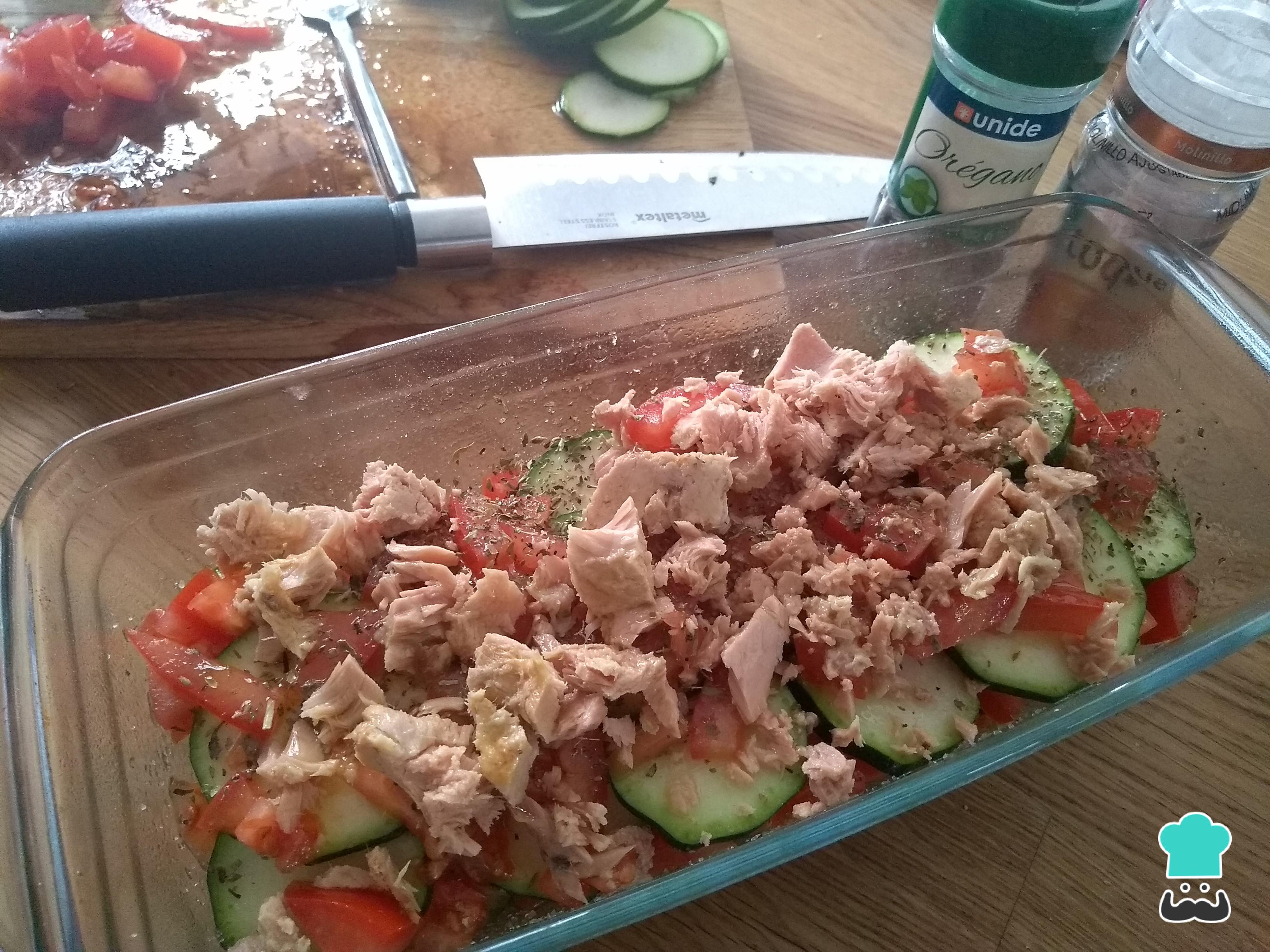 Escurre una de las latas de atún y repártelo sobre la capa de tomate. Vuelve a colocar una capa de calabacín, otra de tomate, espolvorea sal y orégano y, finalmente, la segunda lata de atún. Si lo prefieres, puedes usar atún en aceite.