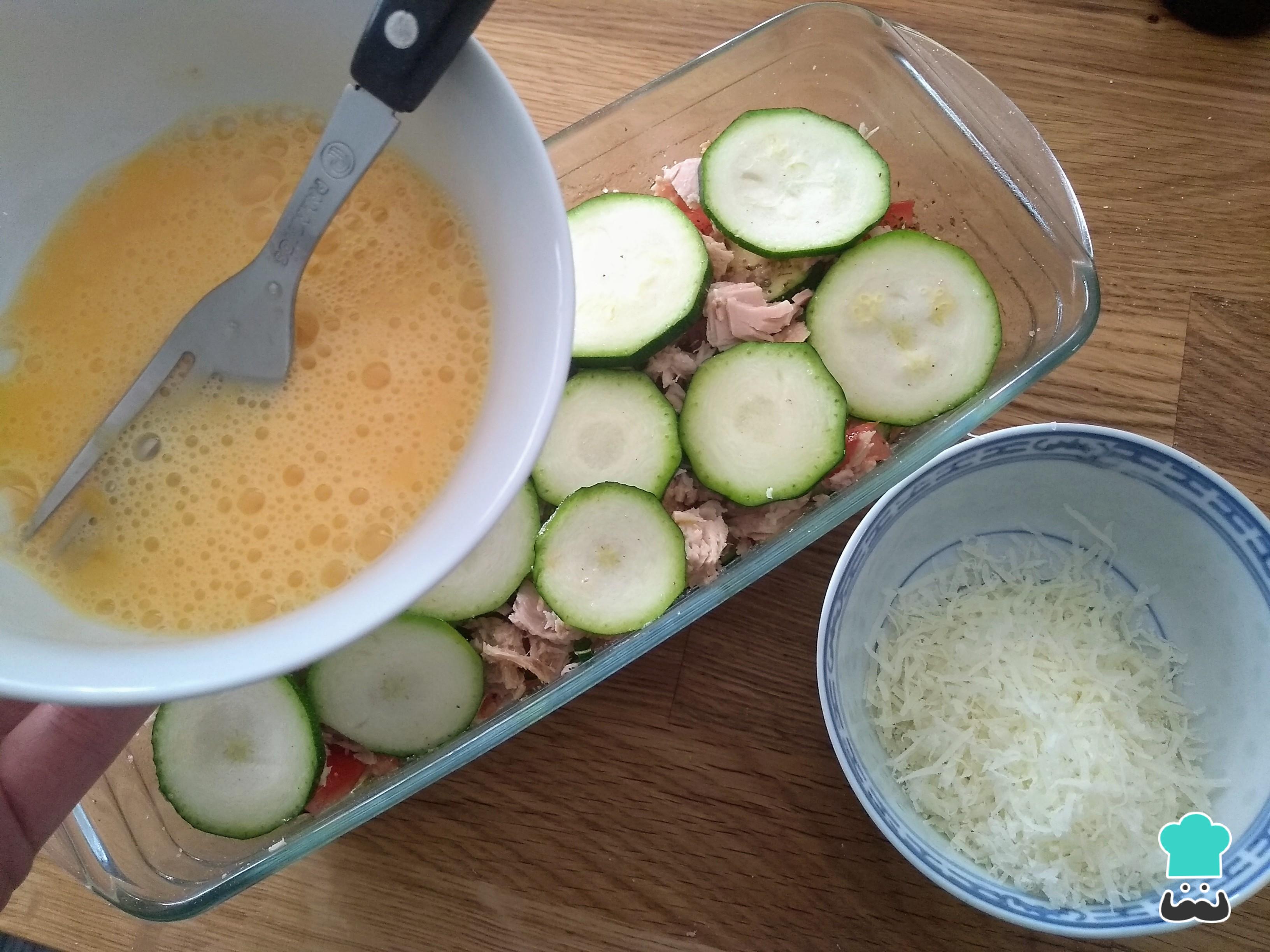 Pon la ultima capa de calabacín y vierte por encima un chorrito de aceite de oliva. Bate el huevo, viértelo sobre elpastel de calabacín con atún y reparte por encima el queso rallado.