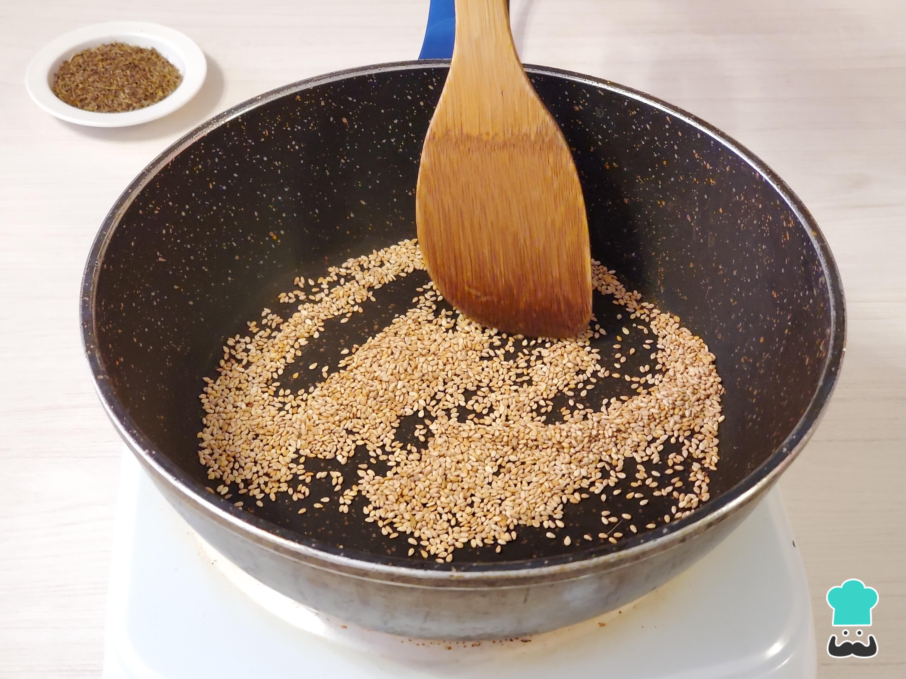En una sartén, coloca las semillas de ajonjolí y tuéstalas para que suelten su aroma y sabor. Luego, retira las semillas, resérvalas y en la misma sartén tuesta el anís. Reserva.