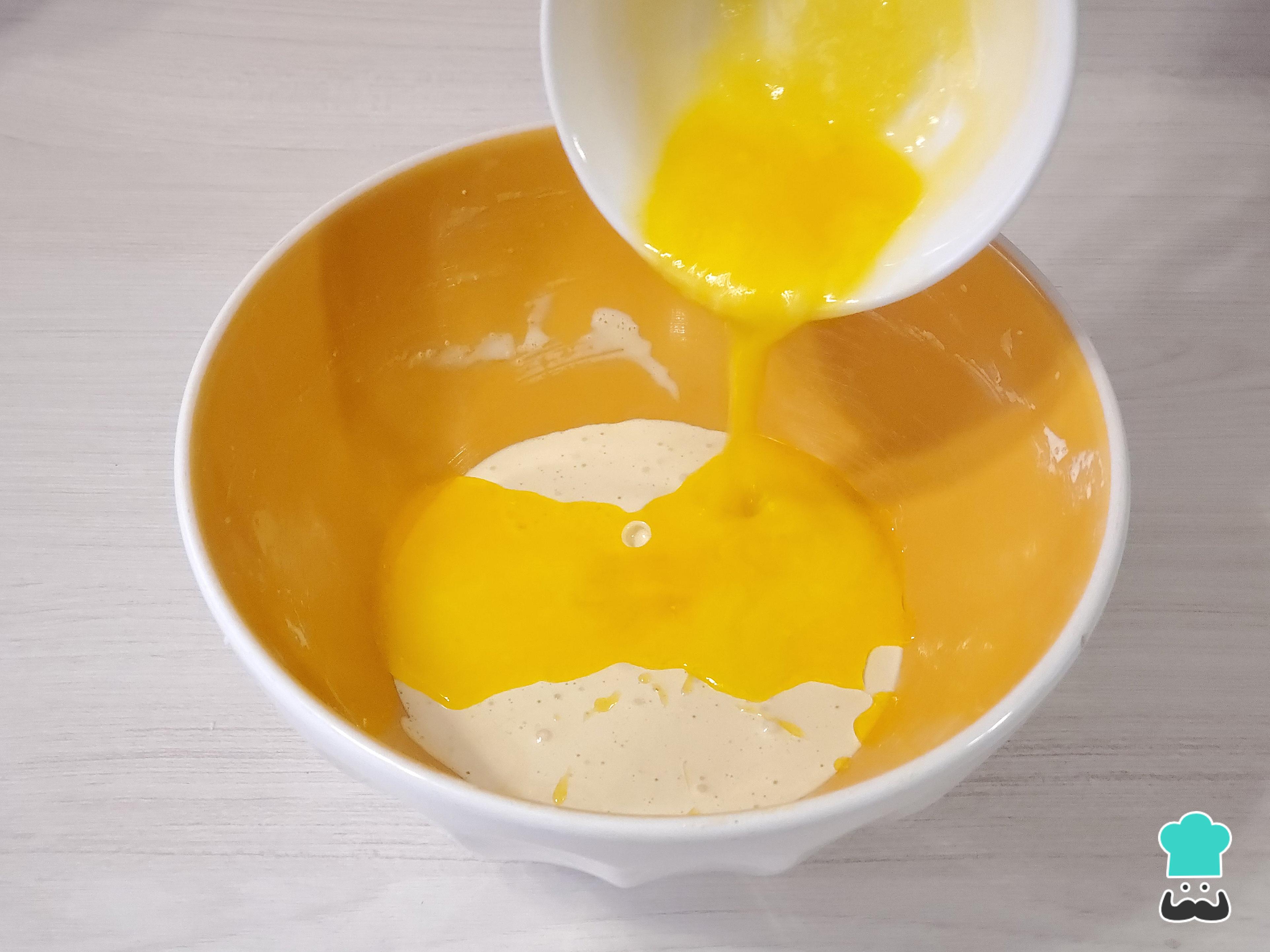 Por separado, en otro bowl bien limpio y seco, vierte las claras y comienza a batirlas hasta que lleguen a punto de nieve. Cuando empiecen a duplicar su volumen, incorpora el azúcar restante en forma de lluvia y sigue batiendo hasta que se formen picos firmes.