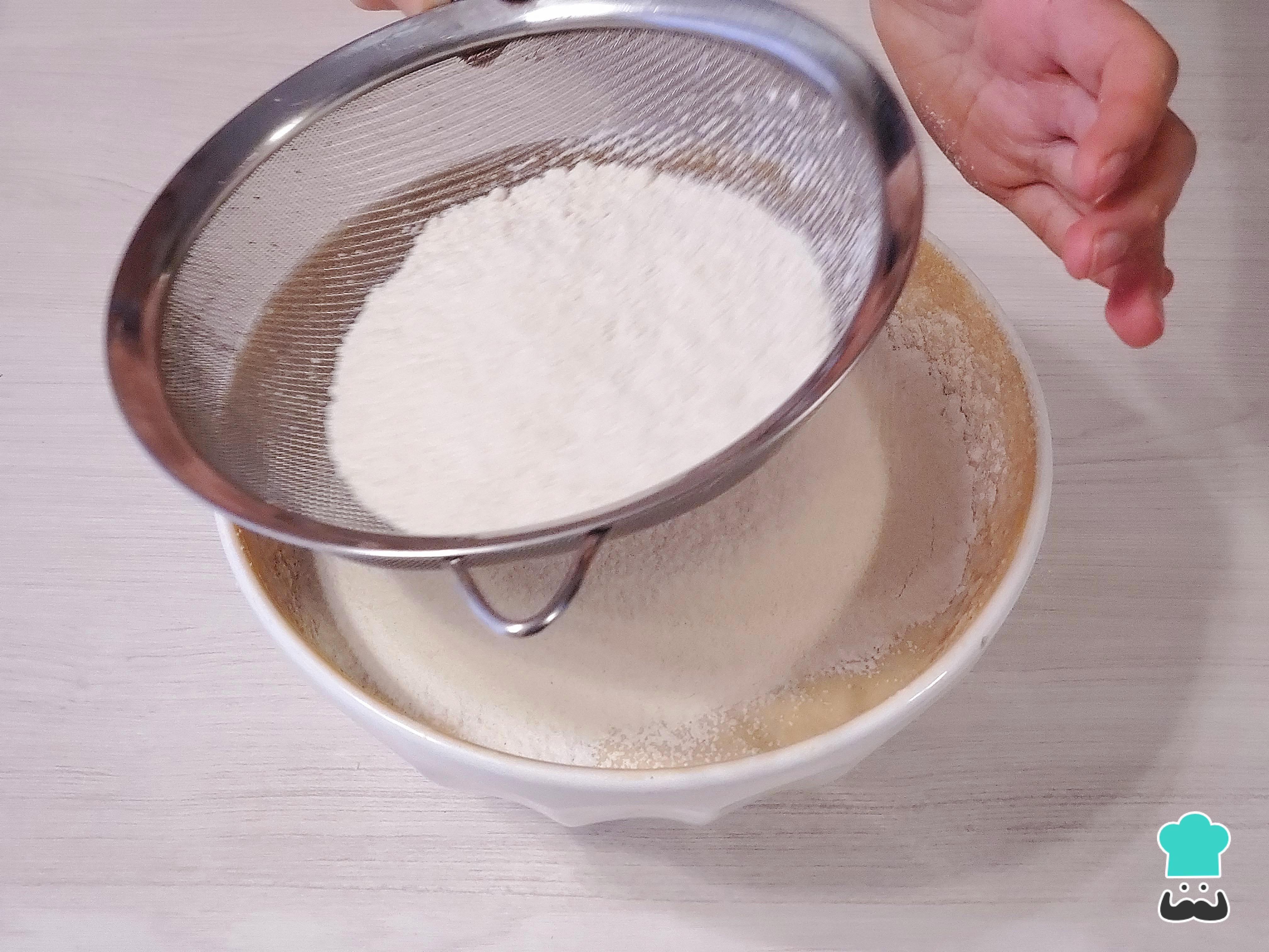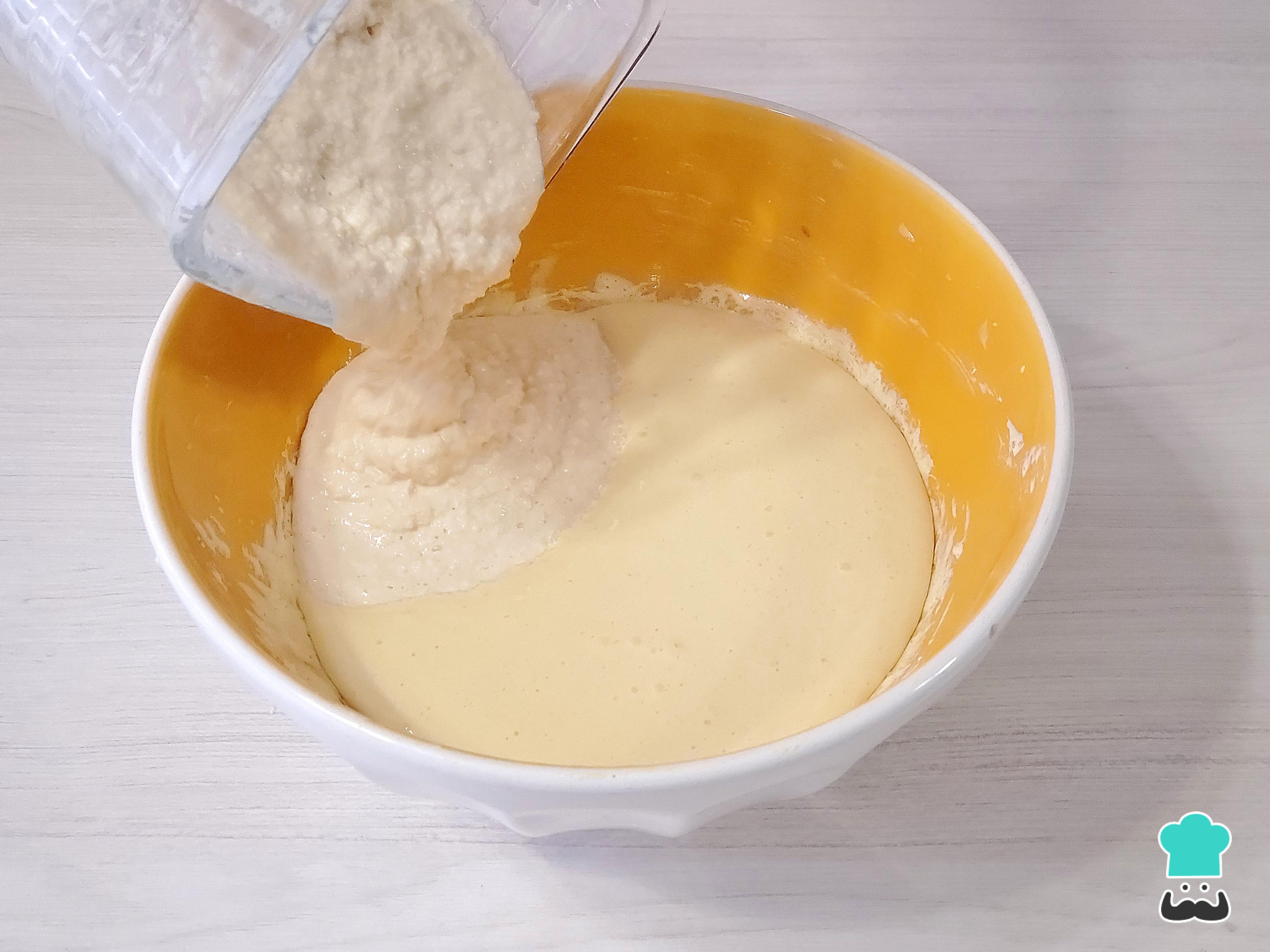 - Licúa bien y, luego, agrega la harina y el polvo de hornear.