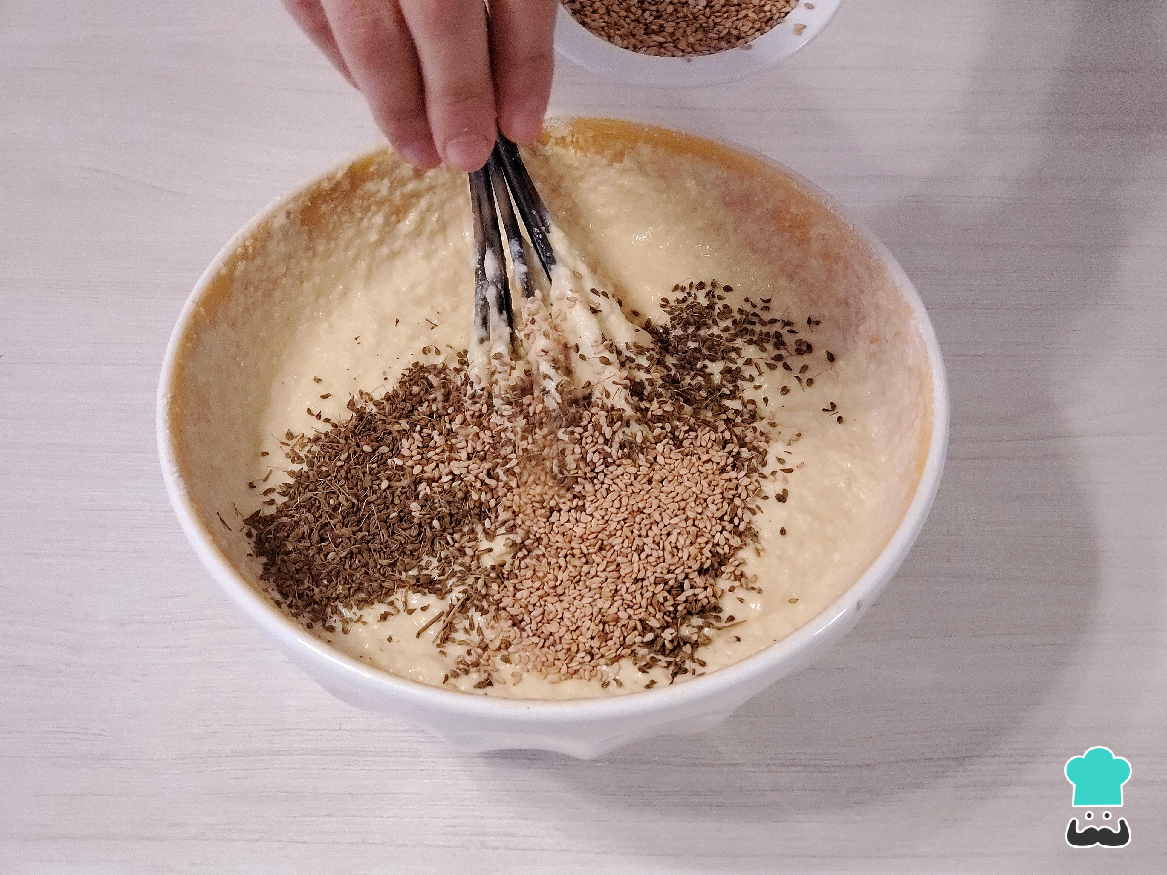 Incorpora las pasas, las semillas de ajonjolí y el anís, mezcla bien y reserva un poco del ajonjolí para decorar.