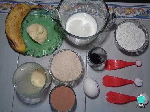 En la siguiente imagen podrás observar los ingredientes que necesitaremos para la preparación de este delicioso pastel de chocolate con relleno de plátano.