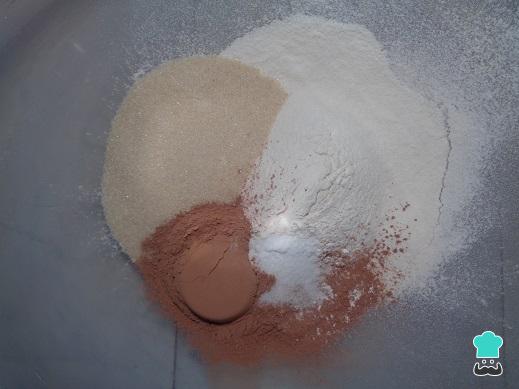 Vamos a comenzar por tamizar los ingredientes secos y colocar en un tazón profundo. Integramos bien la harina de trigo, el azúcar, la cocoa, el polvo para hornear, el bicarbonato de sodio y la sal con ayuda de un globo.