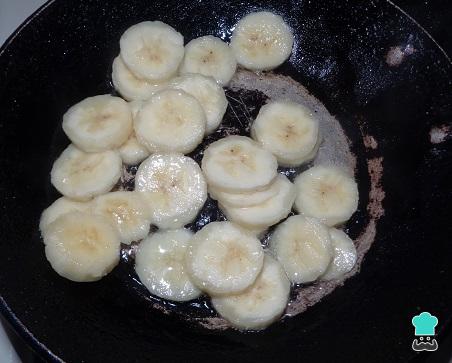 Mientras tanto tomamos aprovechamos para hacer el relleno de plátano. Para ello, rebanamos los plátanos en pequeñas rodajas, de unos 8 milímetros de ancho, y las freímos en un sartén con aceite caliente.