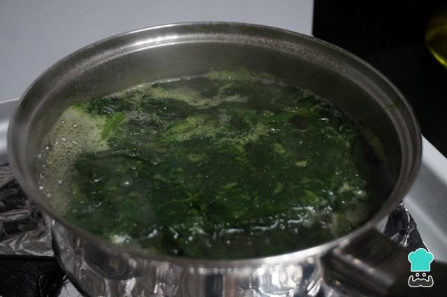 Ponemos a cocinar las espinacas. Si son frescas las salteamos un poco en la sartén con un poquito de aceite.