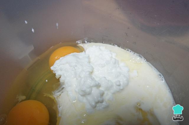 En un bol ponemos los 3 huevos, la leche evaporada y el queso batido, y lo removemos para seguir con la receta de la tarta de espinacas y queso light.