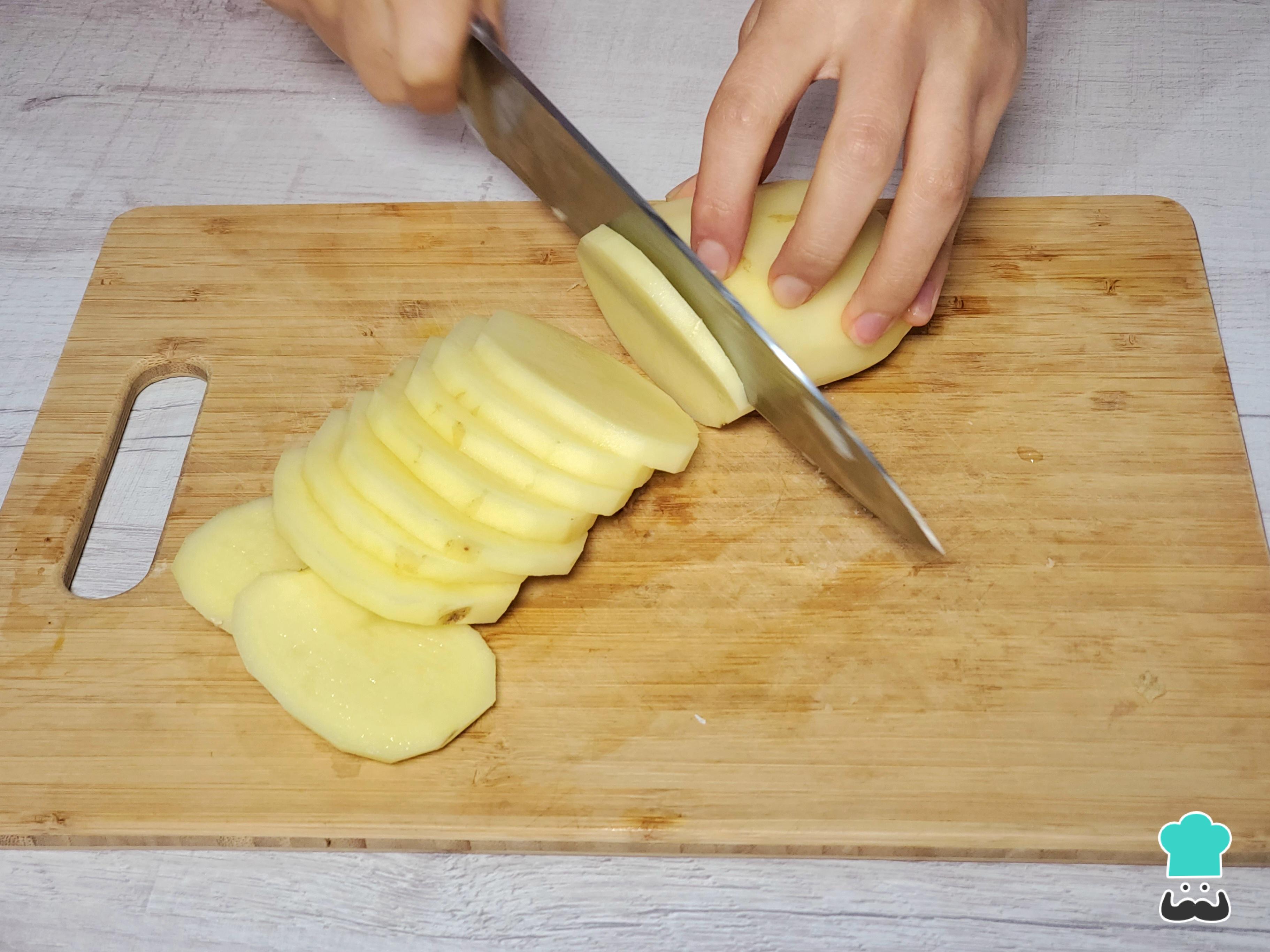 Para preparar el pastel de papa con queso, comienza pelando las papas y cortándolas en rodajas de aproximadamente medio centímetro de grosor.