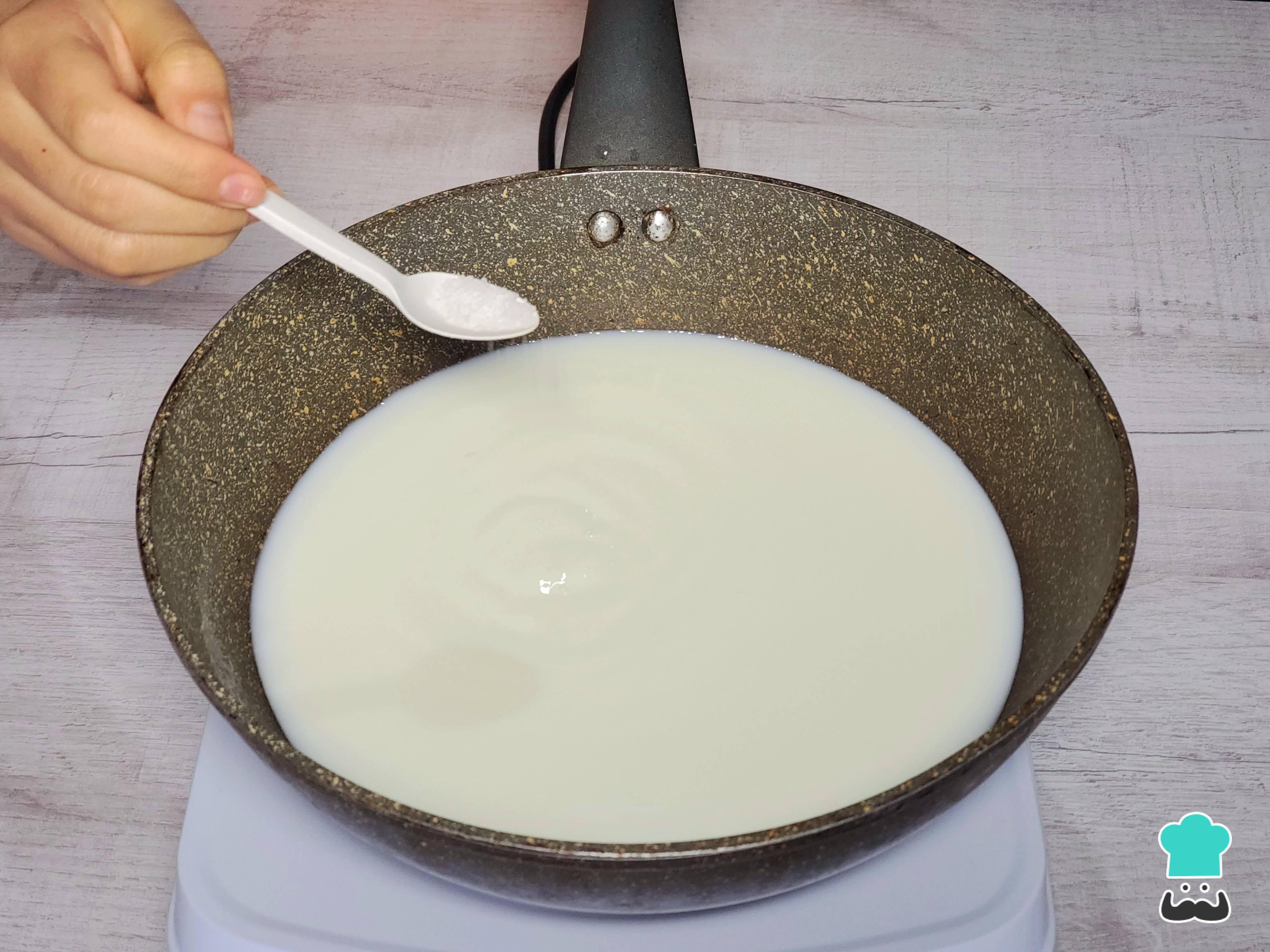 En una sartén amplia y profunda, vierte la leche y sazona con sal, pimienta, nuez moscada y ajo finamente picado o molido. Enciende el fuego y deja que hierva.