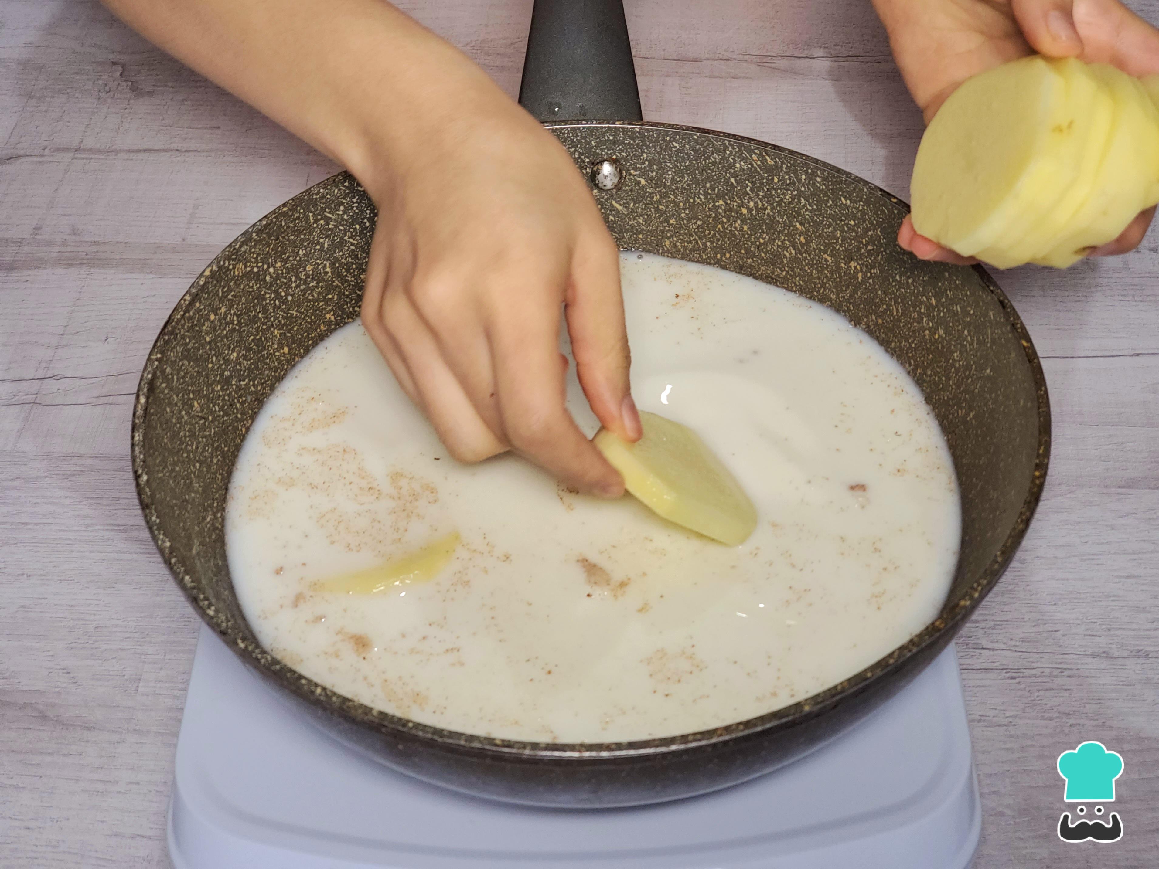 Sumerge las rodajas de papa una por una y cocina en la leche hasta que estén al dente, es decir, que puedas pincharlas, pero aún mantengan cierta firmeza.