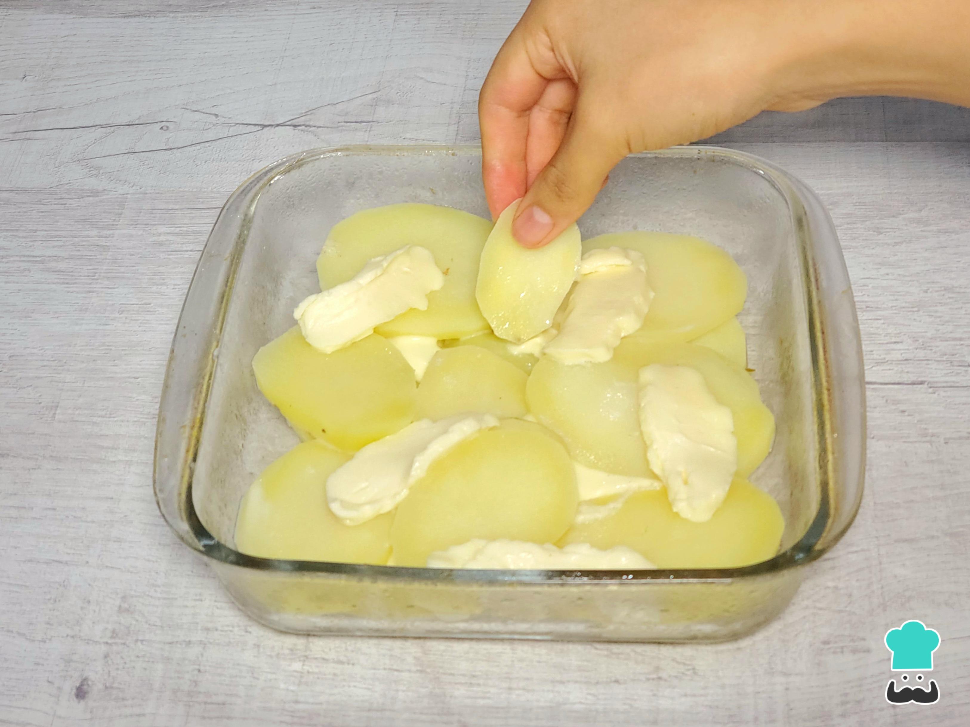 Apaga el fuego inmediatamente y acomoda las papas en una bandeja profunda y resistente a altas temperaturas. Previamente, úntala con mantequilla para evitar que las papas se peguen y facilitar el desmolde. Coloca una primera capa de papas y, encima, una capa de tiras de queso. Repite este proceso alternando capas de papa y queso.